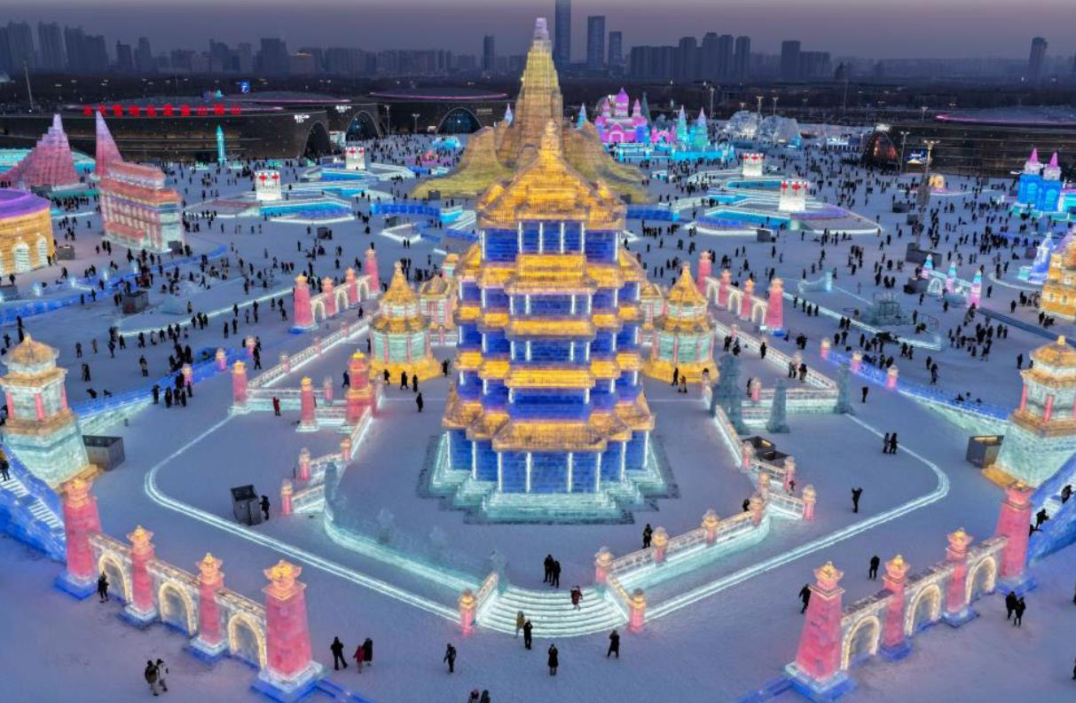 12月17日,第二十七届哈尔滨冰雪大世界开园,本届冰雪大世界以“冰天雪地童话世界”为主题,园区整体面积扩大到120万平方米,用冰用雪量达40万立方米,集冰雪艺术、冰雪文化、冰雪演艺、冰雪建筑、冰雪活动、冰雪体育运动于一体,通过冰雪复刻中国黄鹤楼、比利时王国城堡等建筑,融合展现东方美学和国际风情。图为游客在冰雕黄鹤楼景观区域游玩。中新社