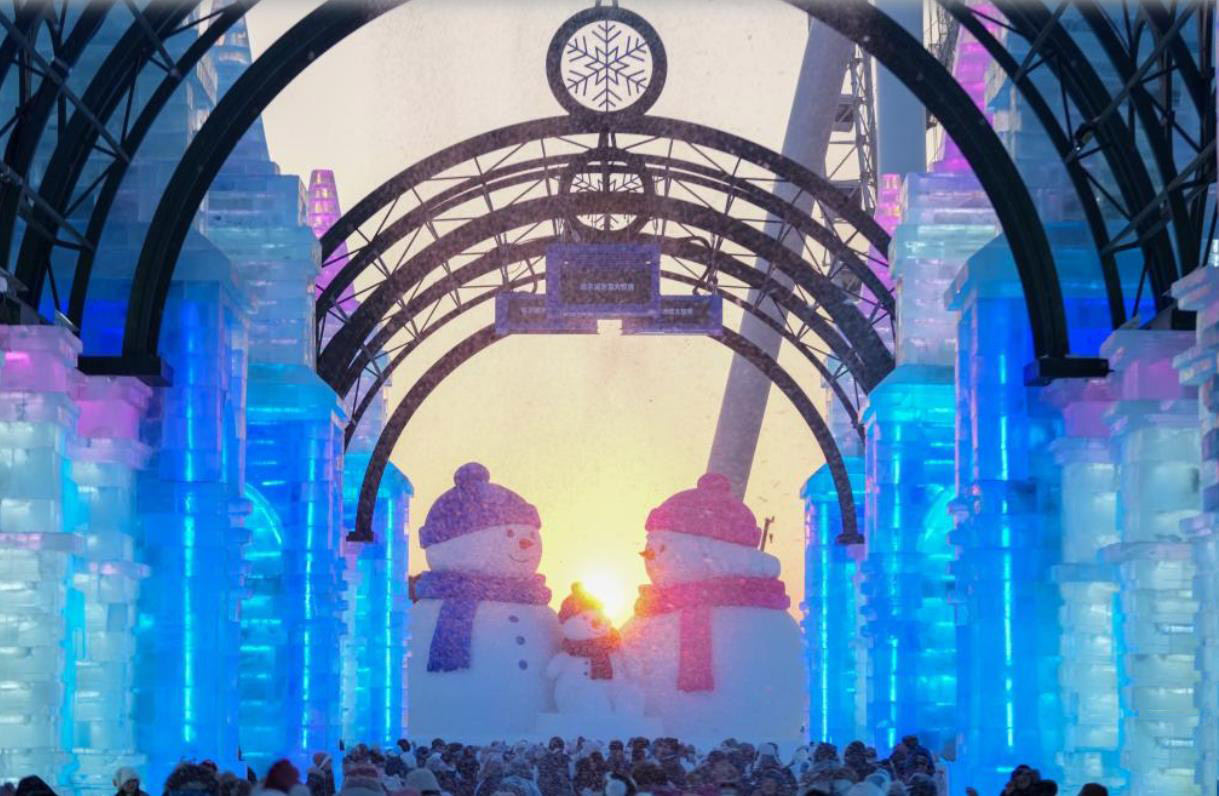 游客在冰雪大世界内主宾省/市景观群(山东岱庙、福建土楼及深圳罗湖口岸)区域游玩。中新社