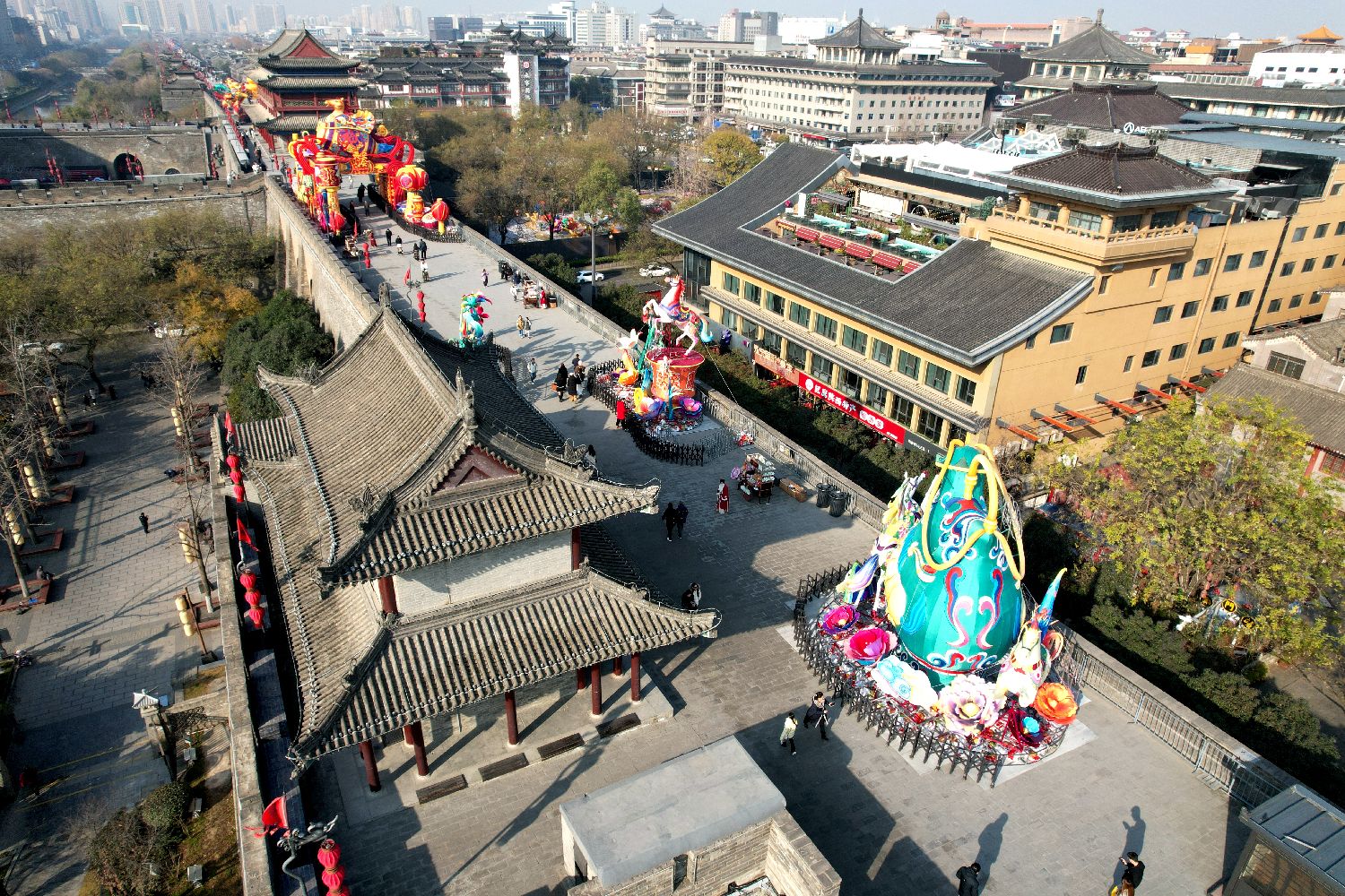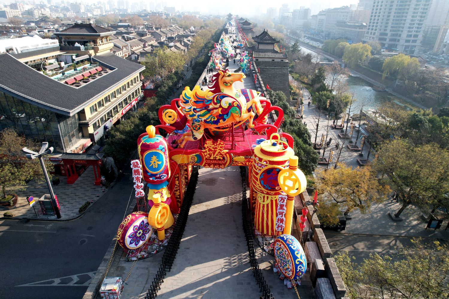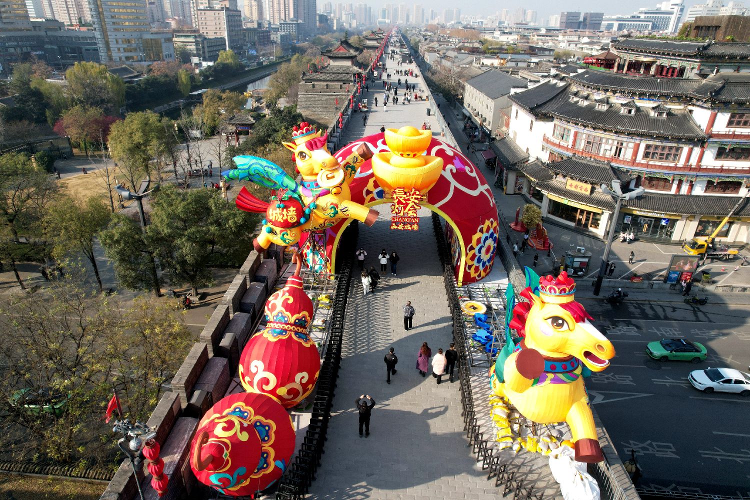 每当城墙上的彩灯逐渐点亮,意味着新春的脚步近了。2026年“长安灯会•西安城墙”则提前到了2026年元旦,西安市民将有近四个月的时间在城墙上感受“长安灯如昼”的快乐。12月17日,灯会筹备工作有序进行中。图为南门城墙上的灯组。中新社