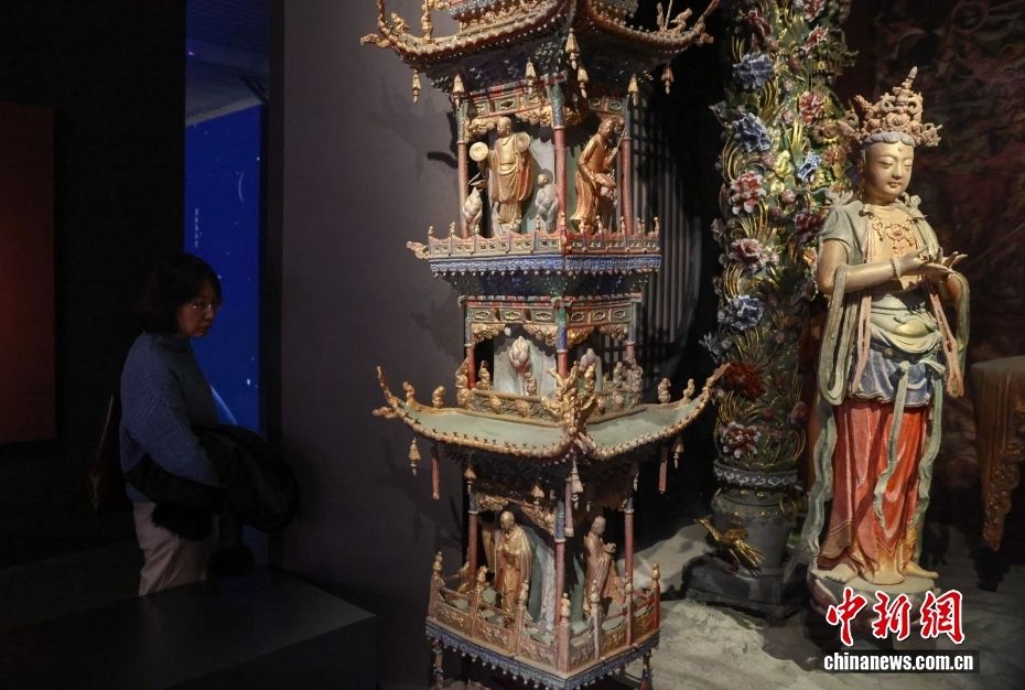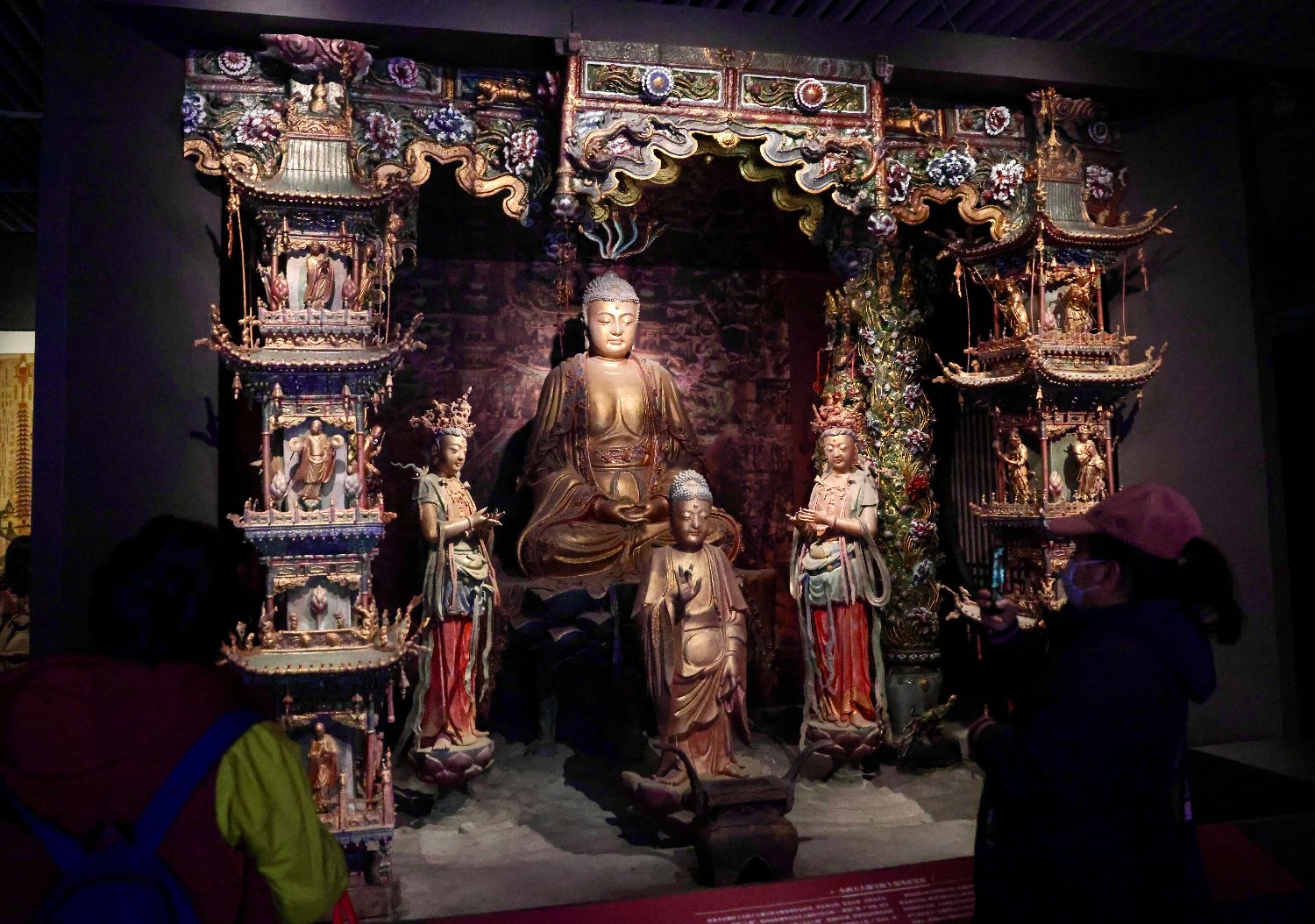 观众参观千佛庵大雄宝殿复原场景内的雕塑。中新网