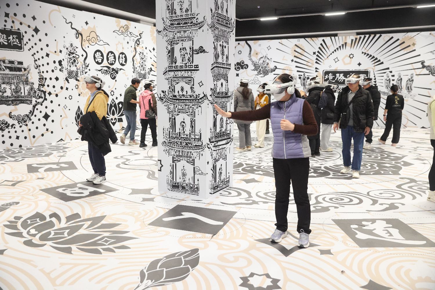 观众戴着VR眼镜感受数字化小西天悬塑。中新社