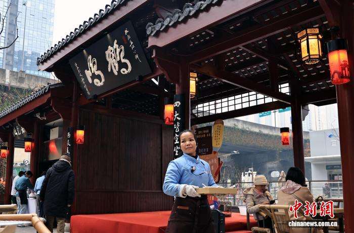 12月18日,鹤鸣茶社“分店”的服务员端着茶点走向茶座。中新网