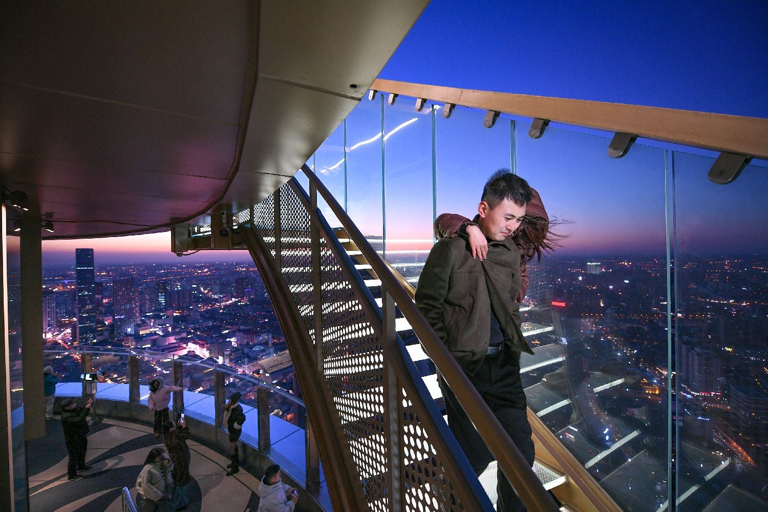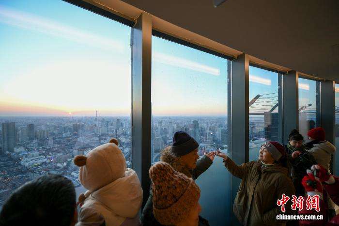 12月20日,民众在津湾云顶高空观景台打卡拍照,观赏城市余晖。中新网