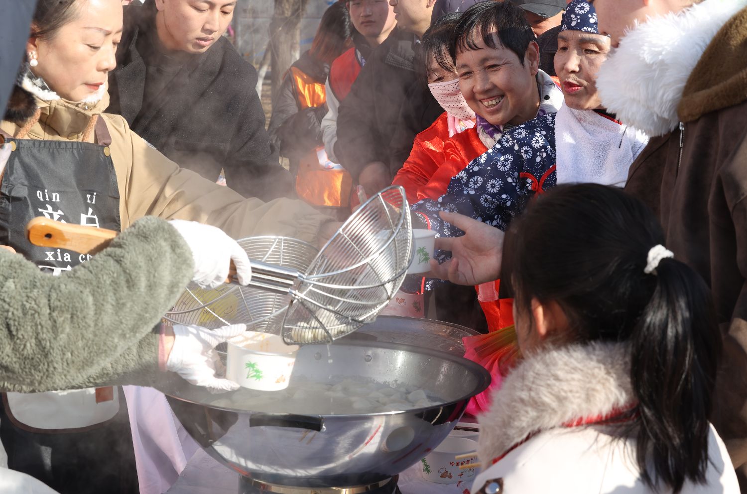 12月21日,“饺香河湟·暖聚冬至”——长桌“暖心宴”在青海西宁举行。环卫工人、城市建设者和市民坐在一起吃饺子、品暖锅。中新社