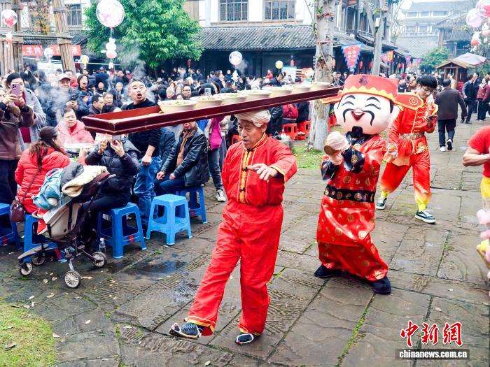 12月20日傍晚,四川泸州合江县尧坝古镇红汤羊肉节120桌的千人长街宴为游客呈现一场丰富的味觉盛宴,人们品尝着热辣滚烫的红汤羊肉,暖心暖胃过冬至。图为“打盆”上菜。中新网