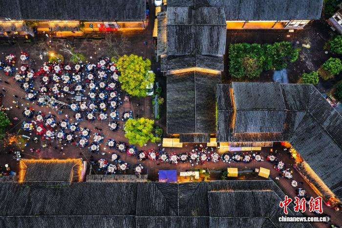 12月20日傍晚,四川泸州合江县尧坝古镇红汤羊肉节120桌的千人长街宴现场。(无人机照片)中新网
