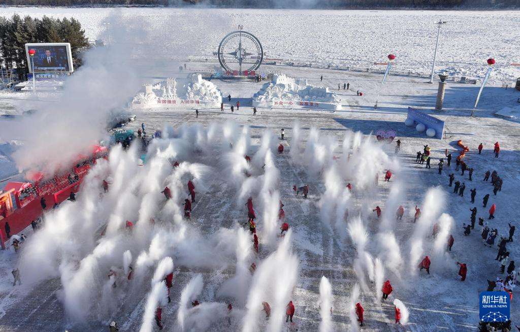 12月21日,漠河第十六届冬至文化节在黑龙江漠河北极村举行。图为“泼水成冰”表演。新华社