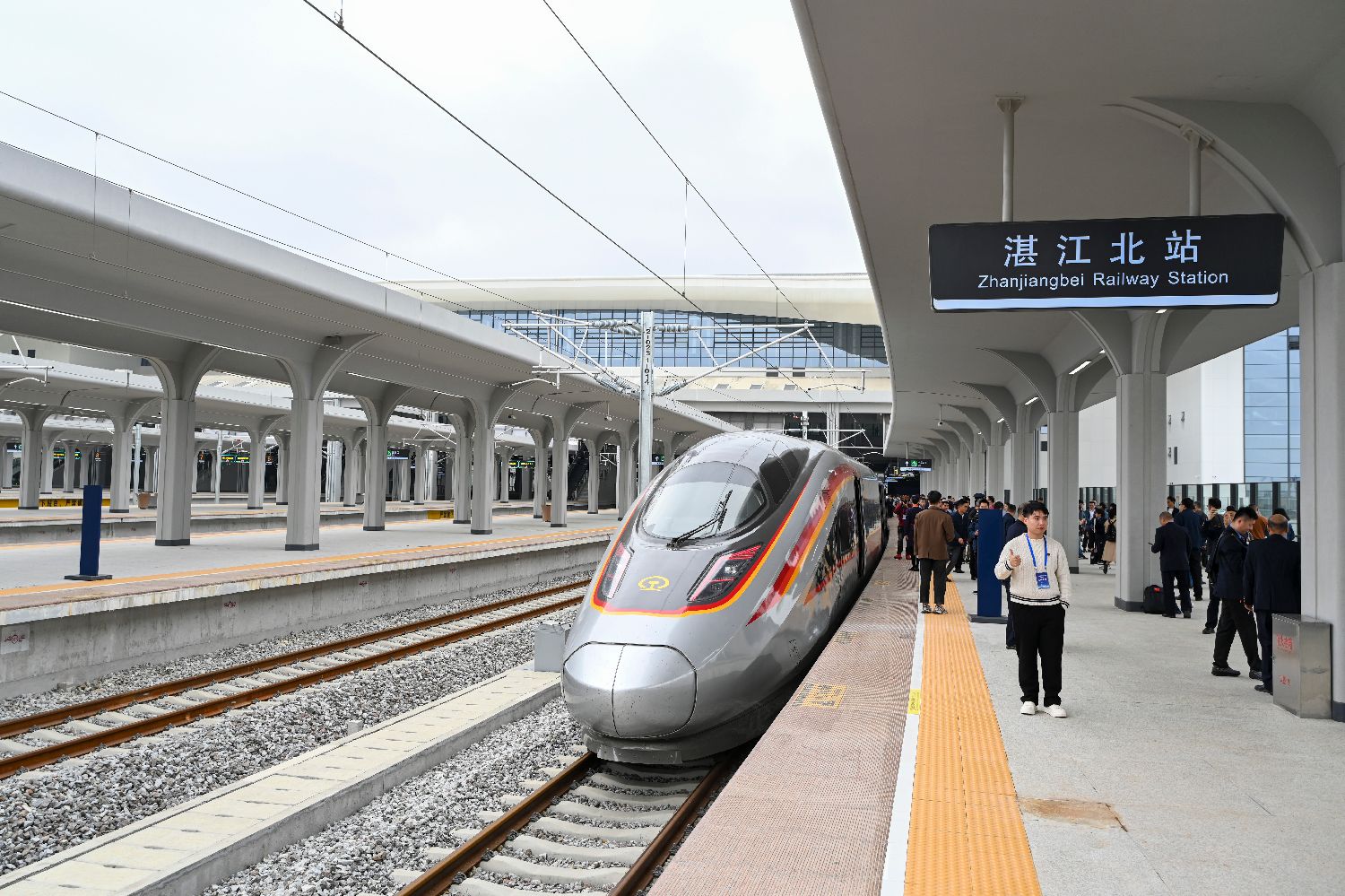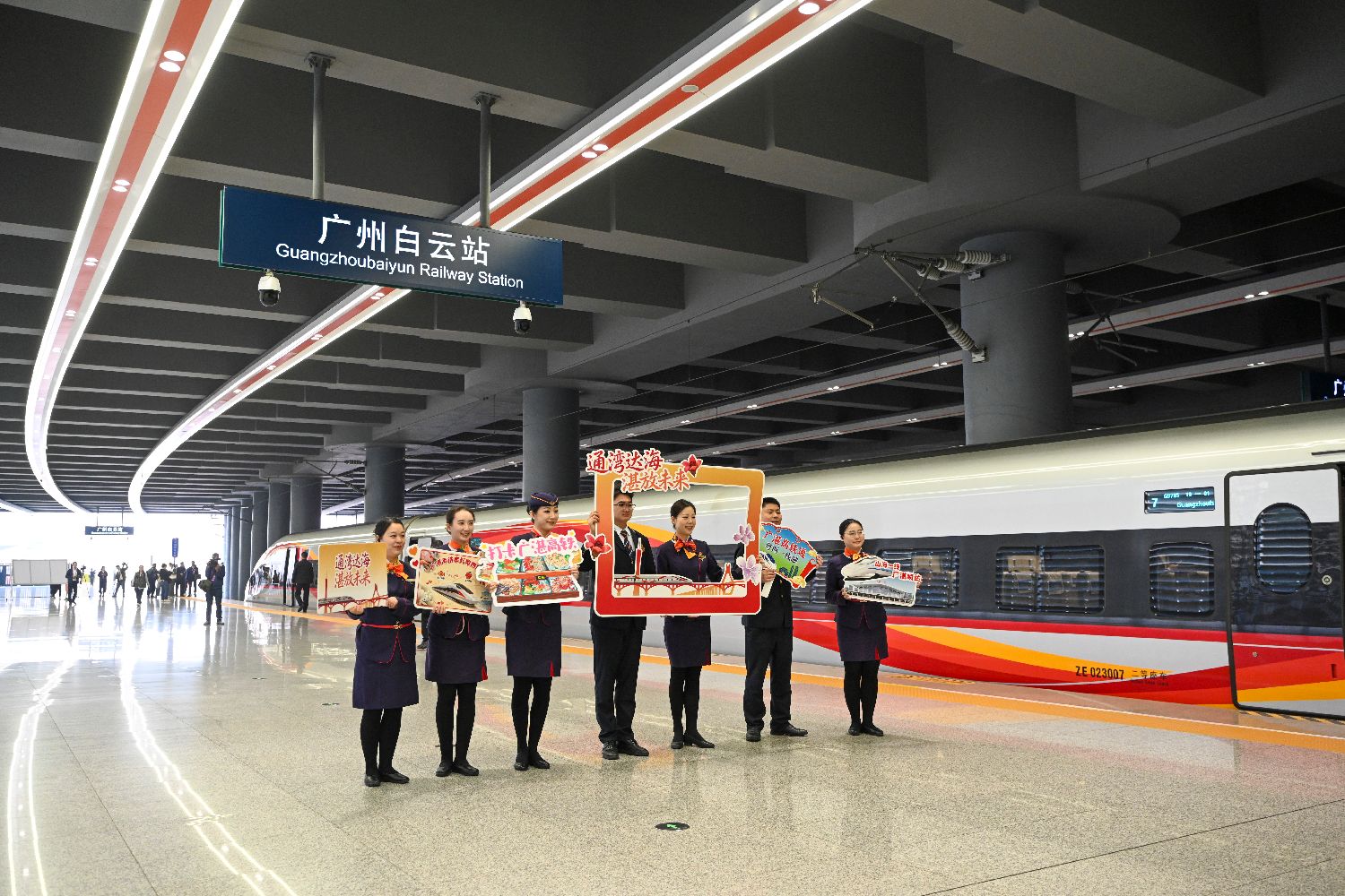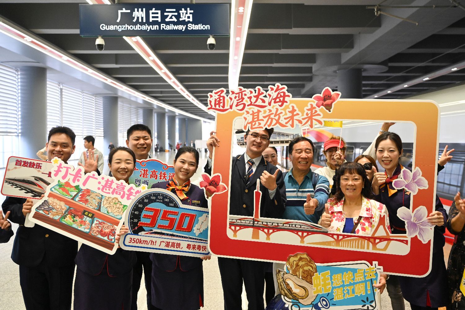 12月22日,广州至湛江高速铁路正式开通运营,广州、湛江两地互达约90分钟,较以往通行时间缩短约1小时。广湛高铁是中国“八纵八横”高速铁路网沿海铁路客运大通道的重要组成部分,正线全长401千米,设计行车速度350公里/小时,是连接粤港澳大湾区和海南自贸港、北部湾城市群的重要通道,途经广州白云、佛山、阳江北、湛江北等10座车站。图为旅客与广湛高铁首发列车车组人员在广州白云站合影。中新社