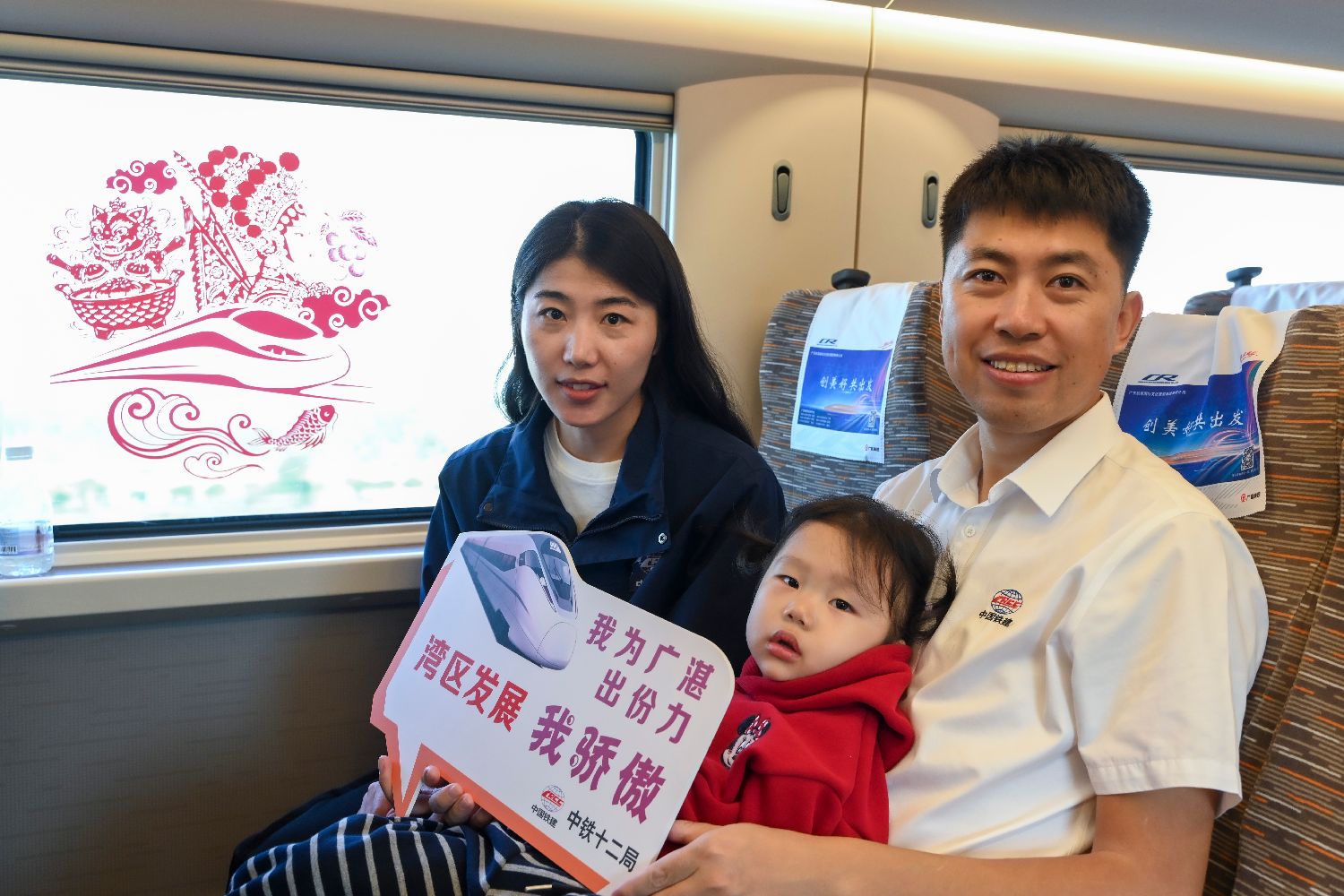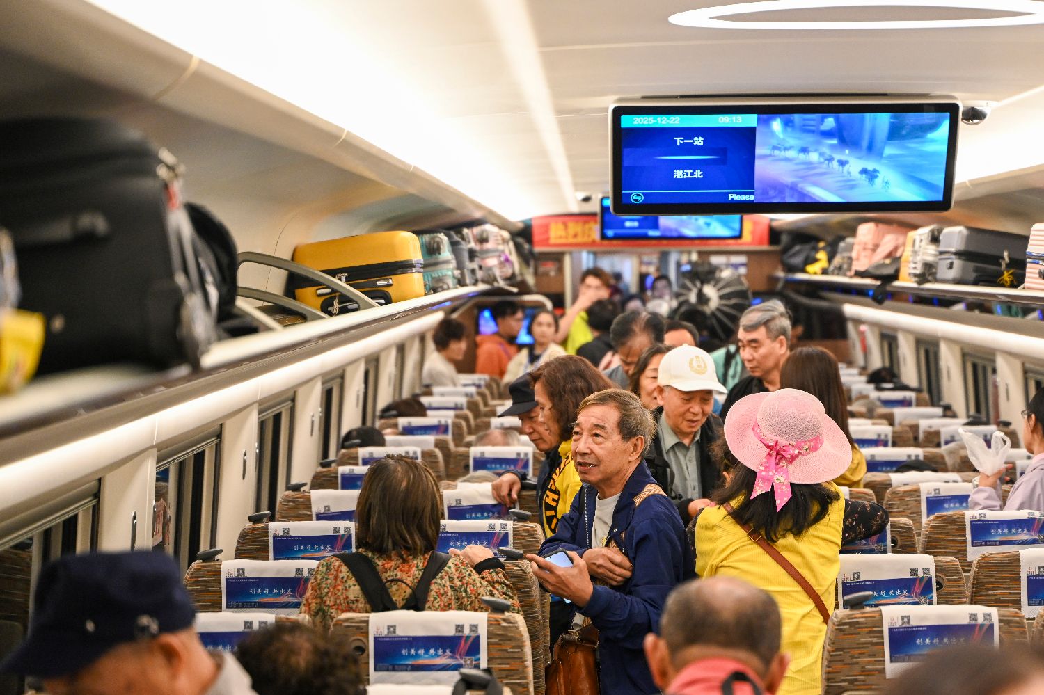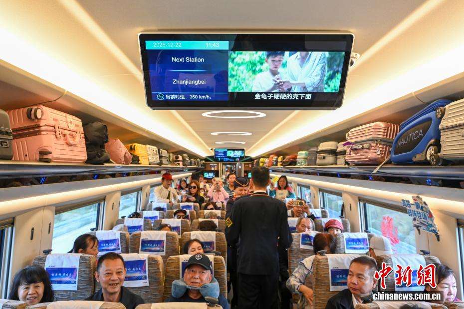 12月22日,广湛高铁建设代表与家人体验首发列车。中新社