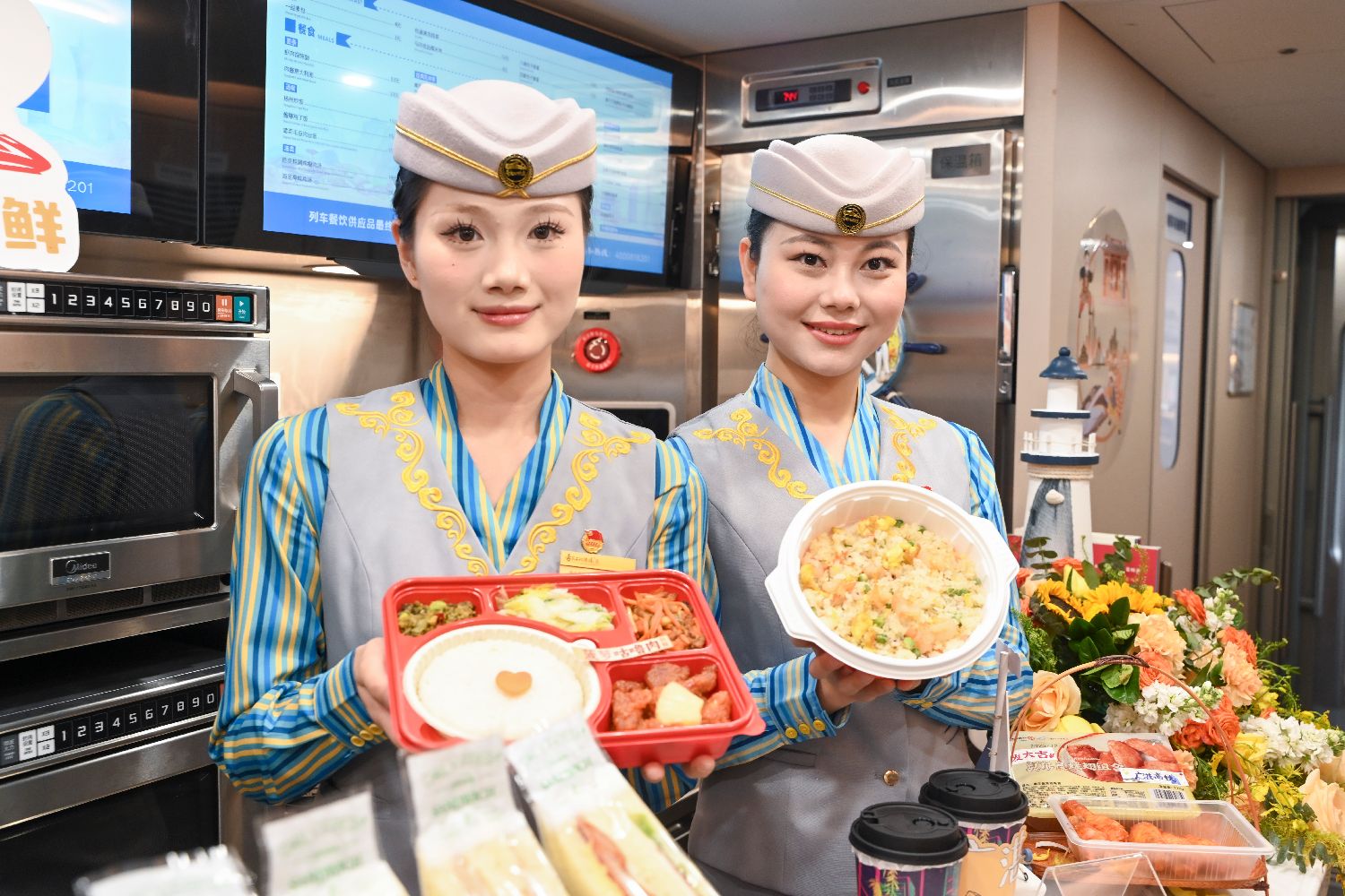 12月22日,广湛高铁列车工作人员展示特色美食。中新社