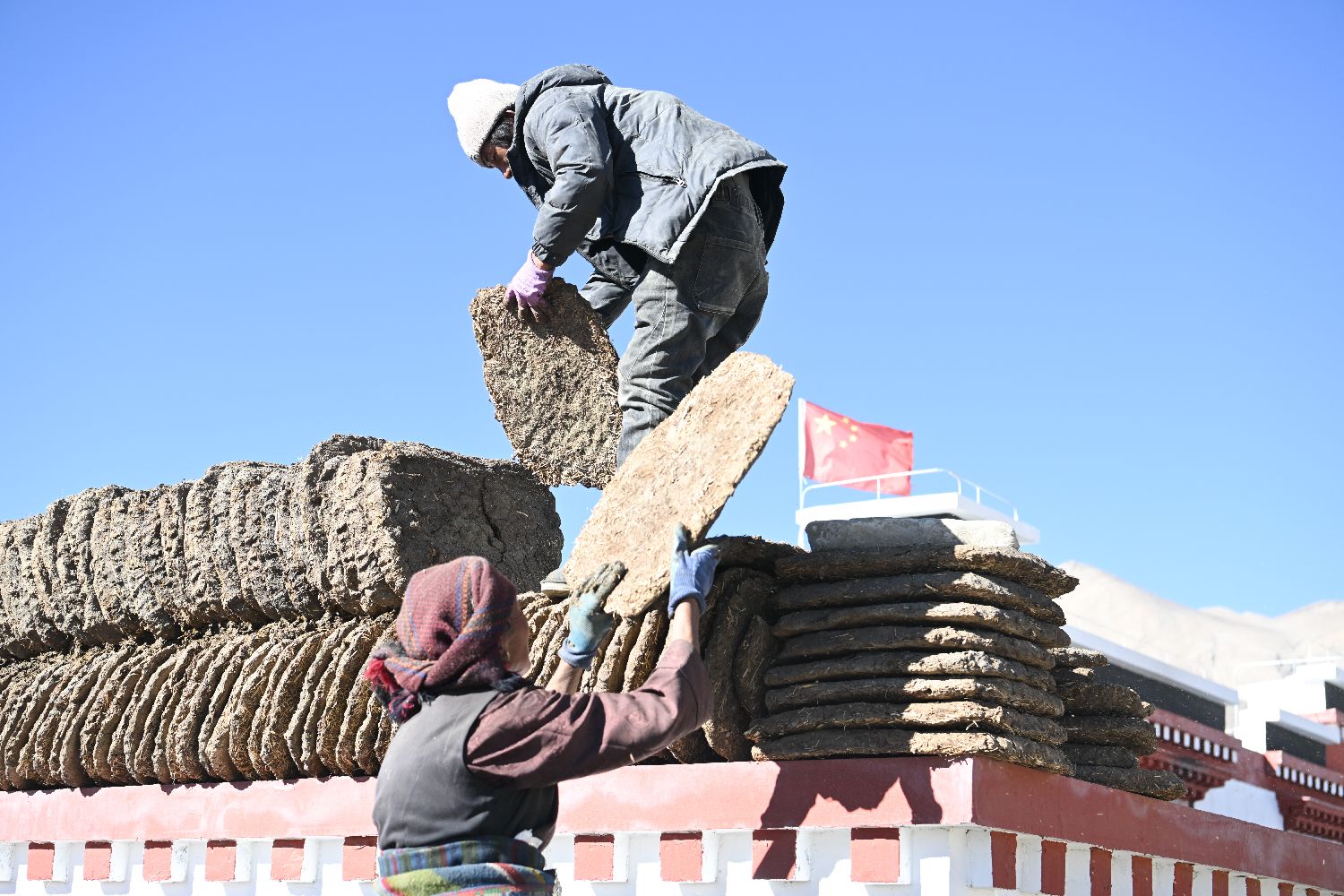 据悉,此次日喀则地震灾后重建覆盖7县47乡镇486村,2.2万余户重建民房、1.05万余户维修加固民房已全部竣工交付,受灾民众喜迁新居。图为重建后的森嘎村村民在自家的新房围墙上摆放干牛粪。中新社
