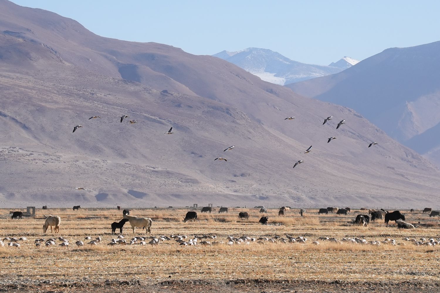 森嘎村境内的农田里斑头雁在觅食。中新社