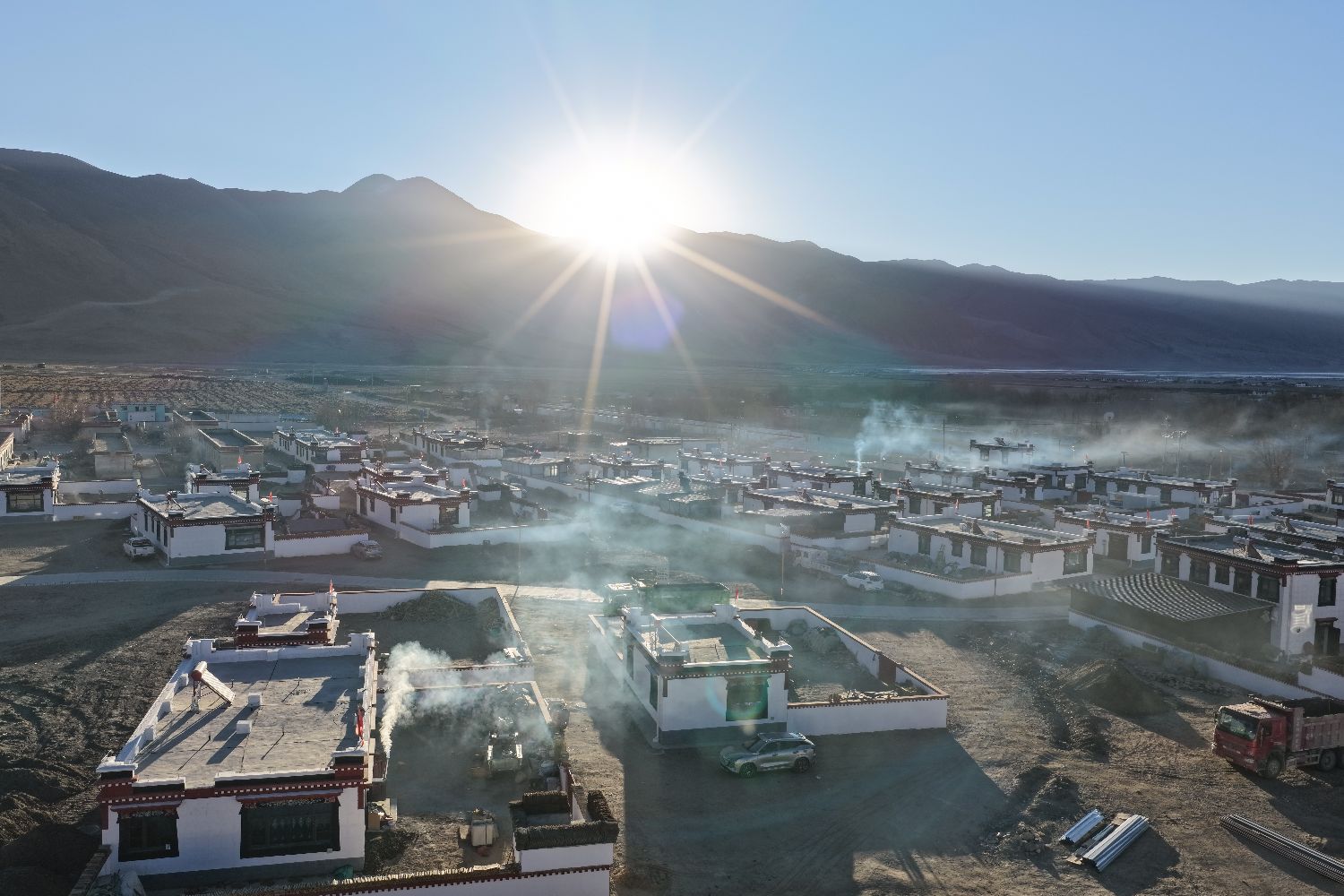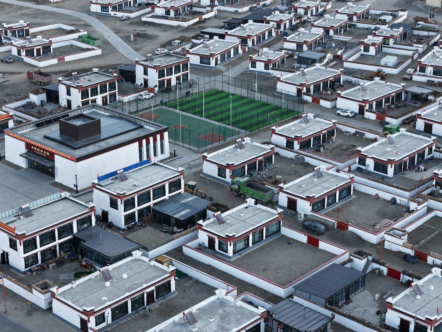 2025年1月7日,西藏定日发生6.8级地震,时隔近一年,12月24日,探访灾后重建的日喀则森嘎村可以发现,藏式新房错落有致,柏油路连通家家户户,屋顶太阳能热水器整齐排列,炊烟袅袅间满是生机。图为重建后的森嘎村清晨。(无人机照片)中新网