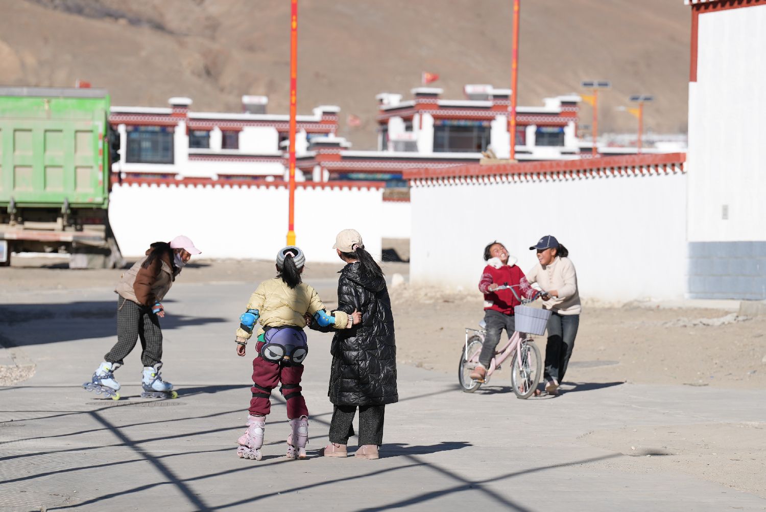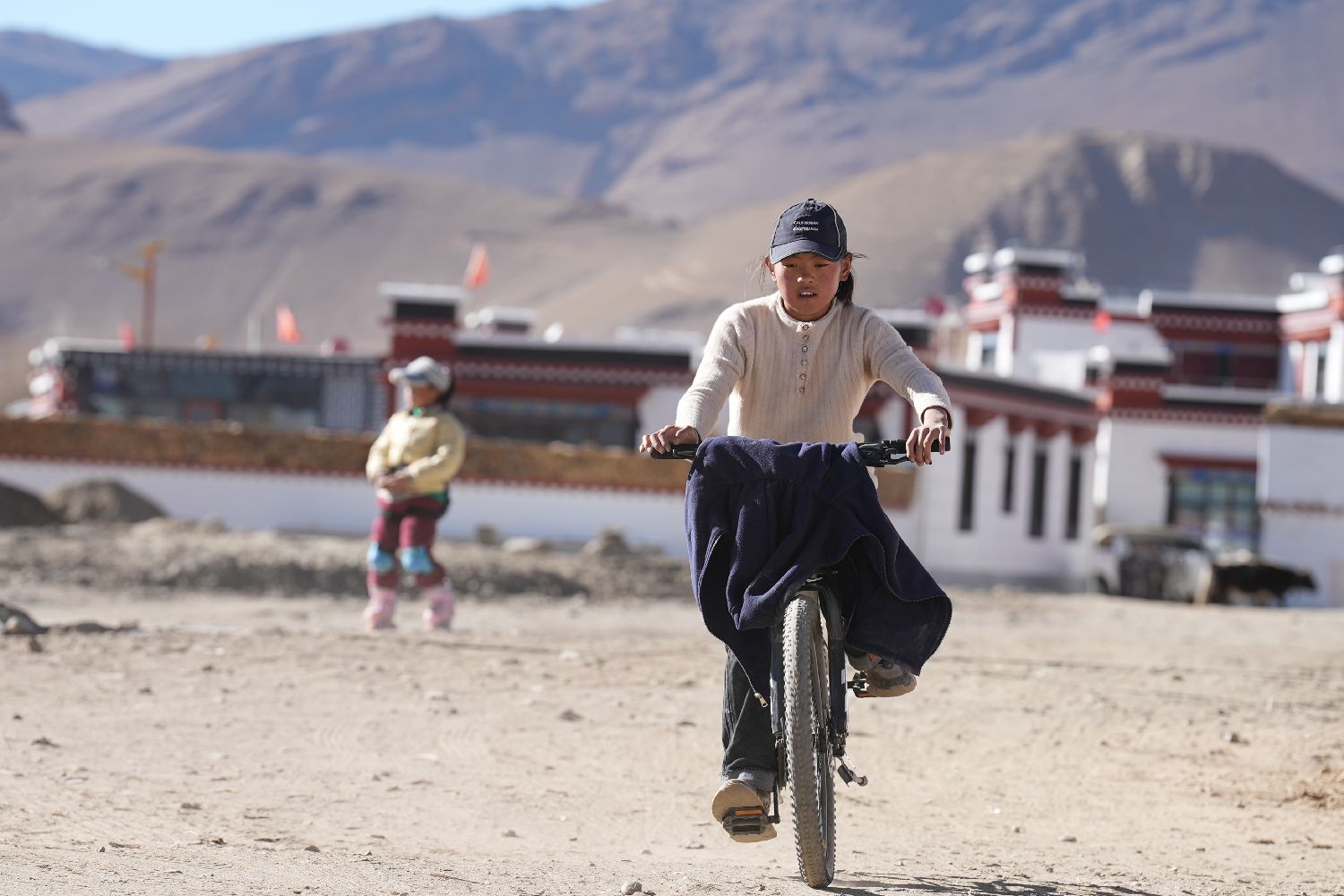 12月24日,森嘎村的一个女孩在新房前骑自行车。中新社