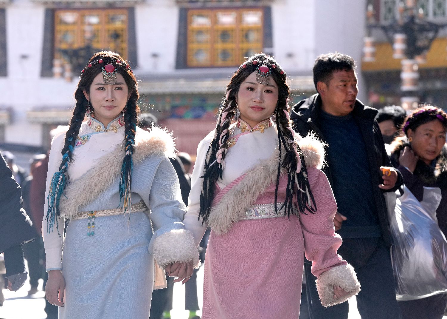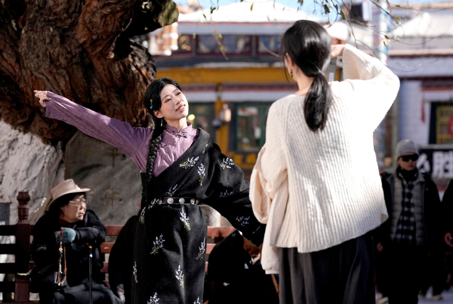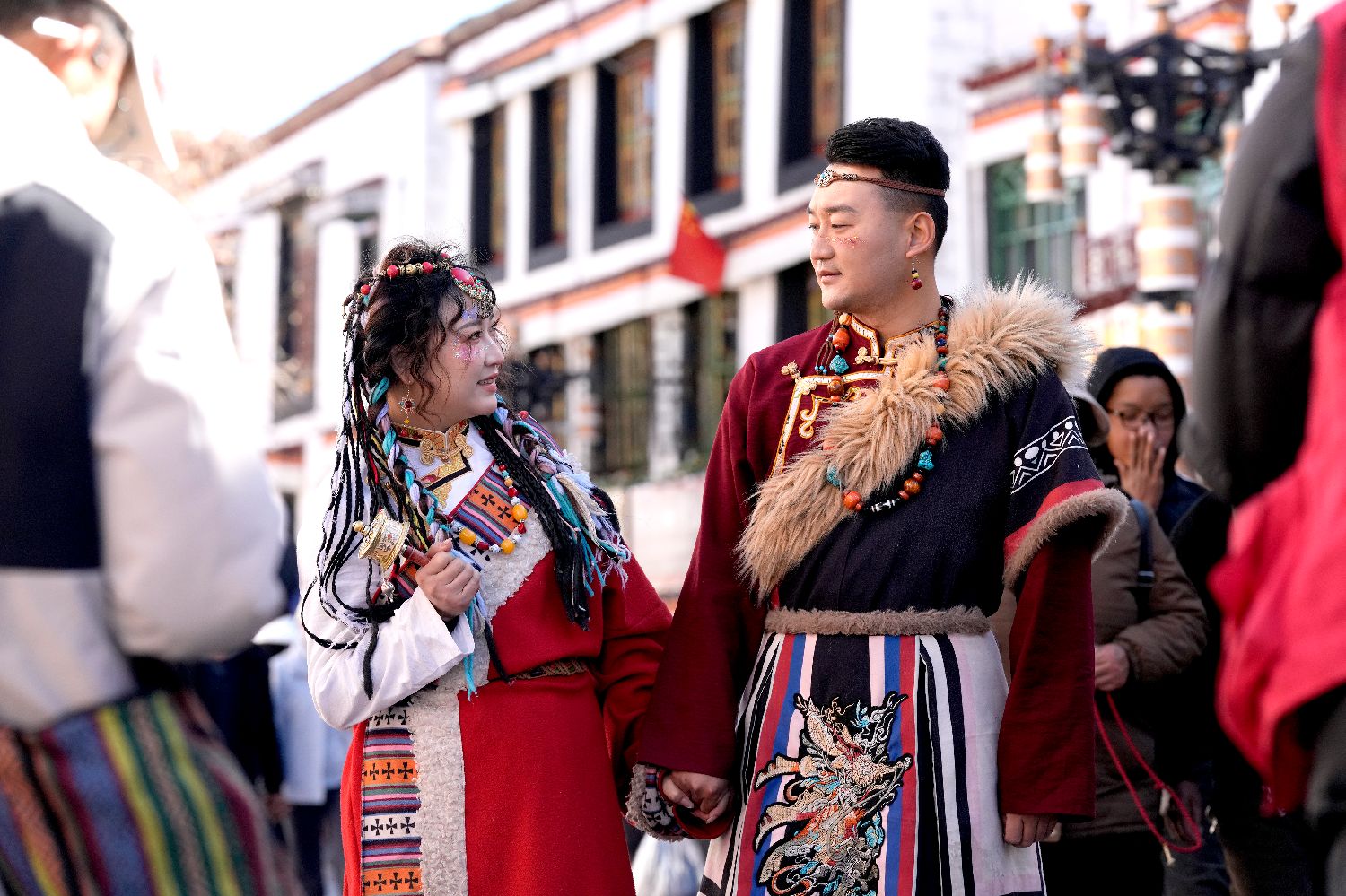 在第八轮“冬游西藏”活动持续推动下,不少游客选择在冬季走进西藏,感受雪域高原的独特魅力。除了免费游览布达拉宫、罗布林卡等景区,体验藏服写真也成为大多数游客行程中的“必选项”。图为12月24日,游客在拉萨市八廓街拍摄藏服写真。中新社