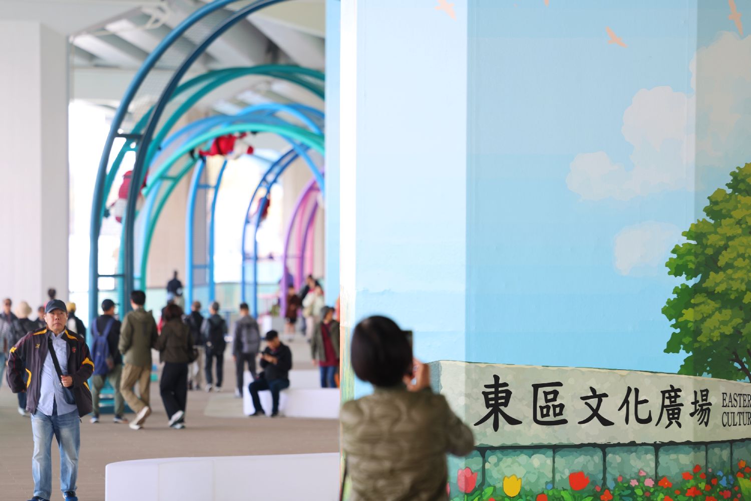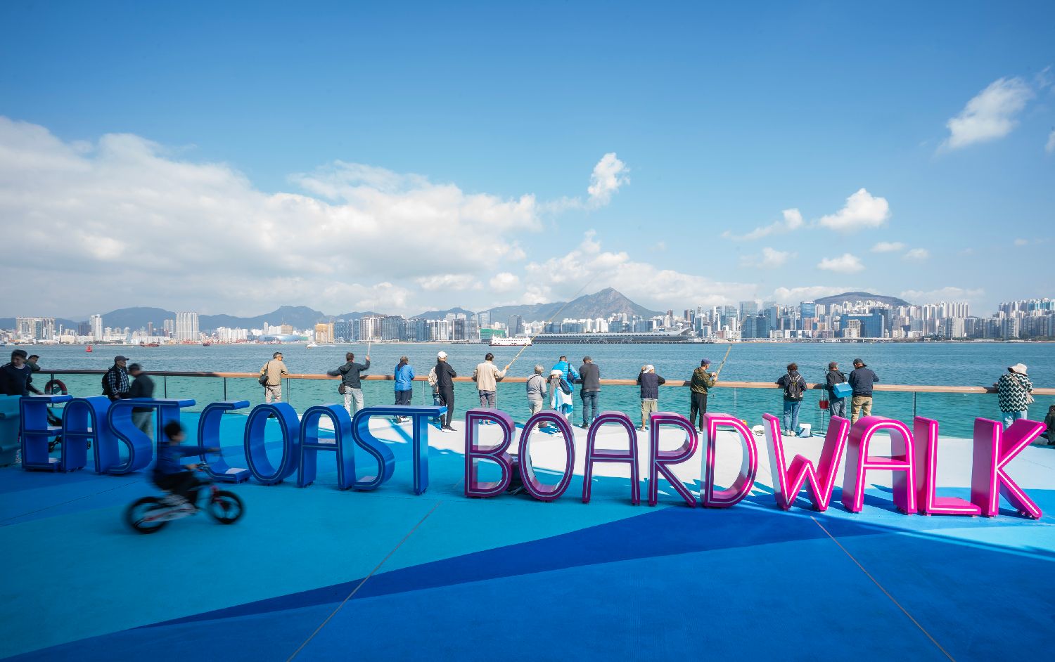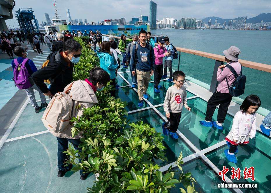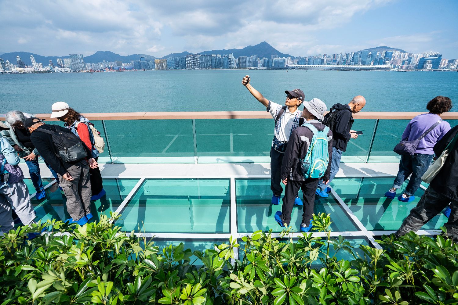 12月29日,位于香港北角至鲗鱼涌的东岸板道(东段)向公众开放,标志着由坚尼地城至筲箕湾全长约13公里的港岛海滨正式贯通。图为市民游客在东岸板道(东段)观景玻璃栈道上参观拍照。中新社