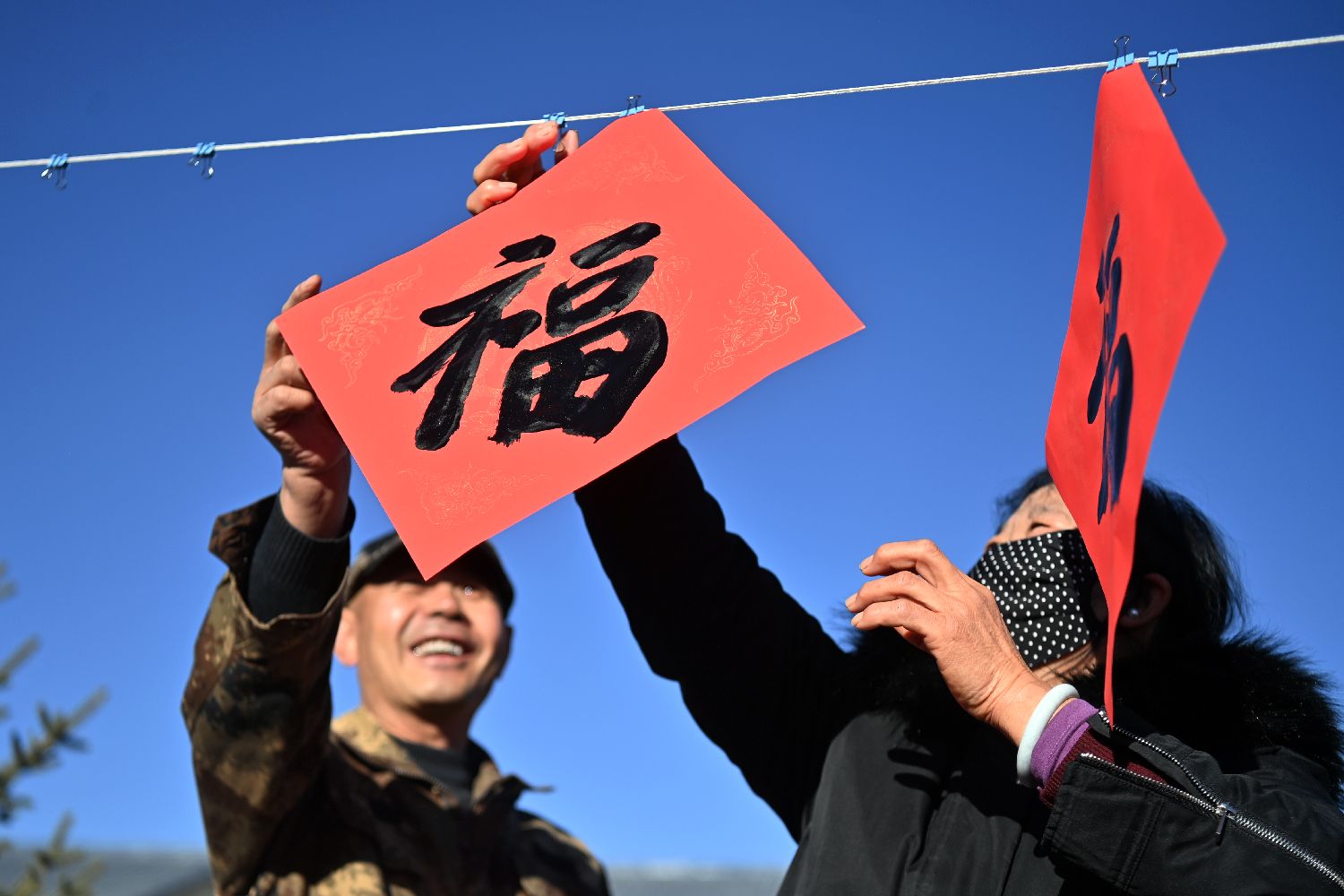12月29日,在榆中县旧庄沟村集中安置点,村民悬挂新写的福字。中新社
