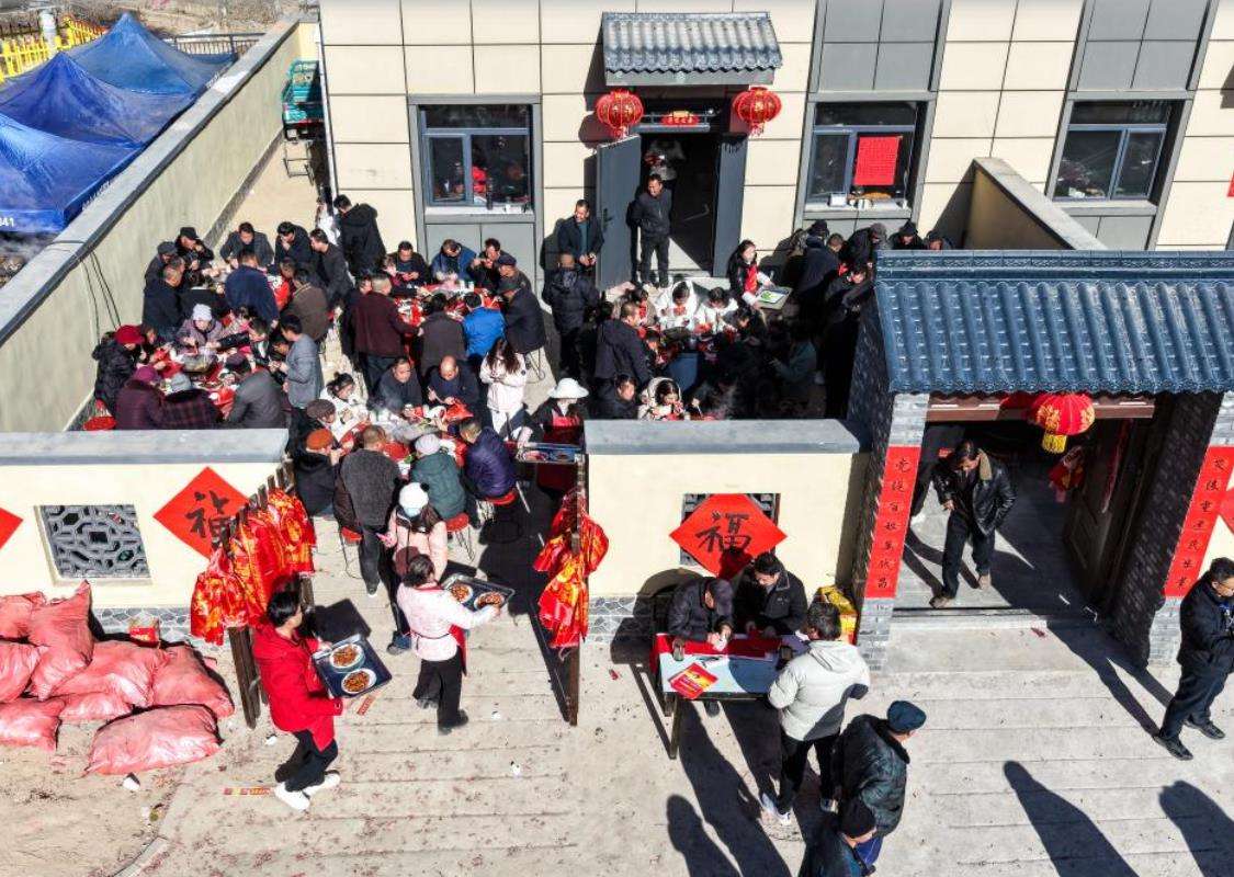 12月29日,在榆中县马坡乡旧庄沟村集中安置点,搬进新家的村民备下乔迁宴邀请亲朋好友。中新社