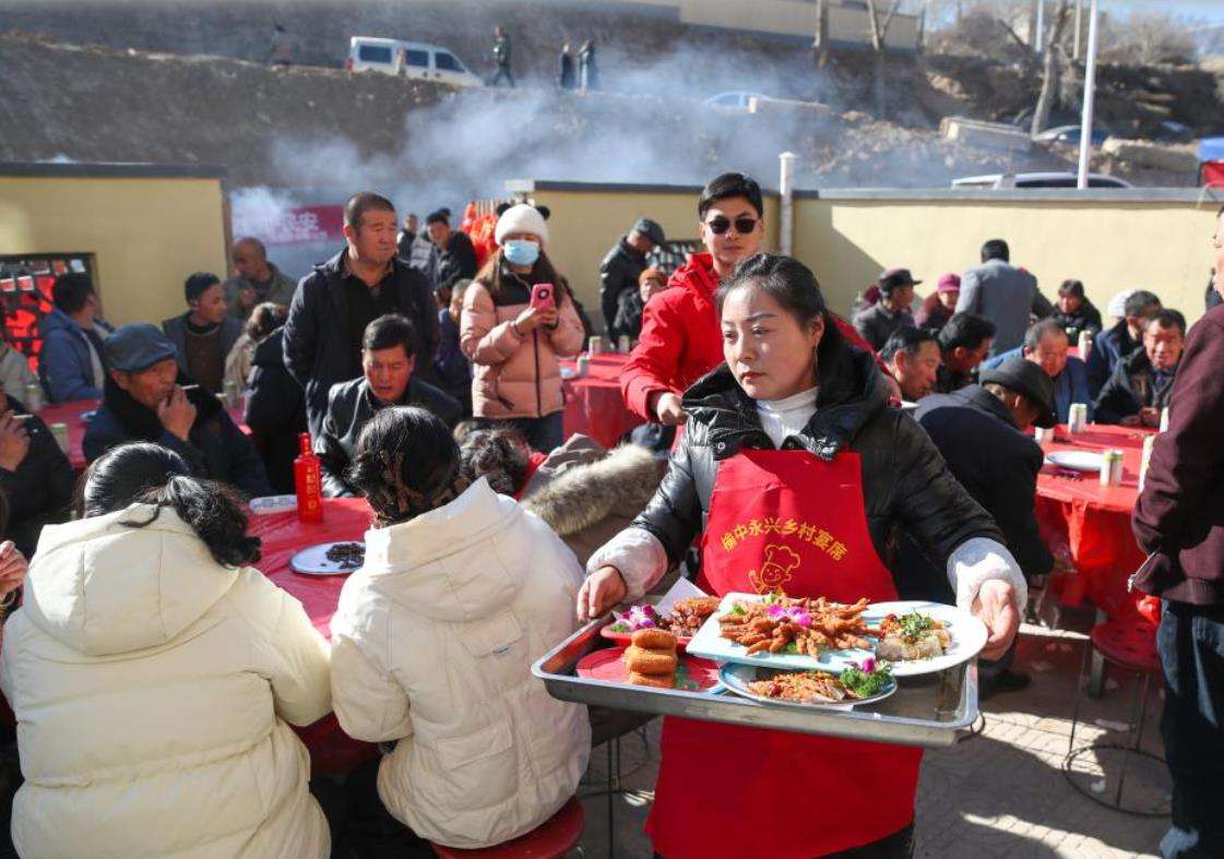 12月29日,帮厨人员在榆中县马坡乡马莲滩村集中安置点的乔迁宴上端菜。新华社