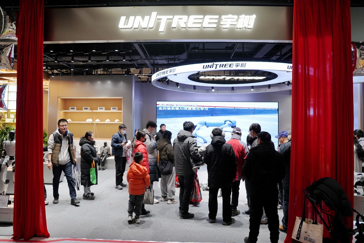 12月31日,宇树科技首家线下门店在北京开业,消费者可以在实体店内直观感受机器人在家庭、教育、娱乐、助老等场景中的实际应用。图为消费者在店内观看实时端到端AI深度强化学习。