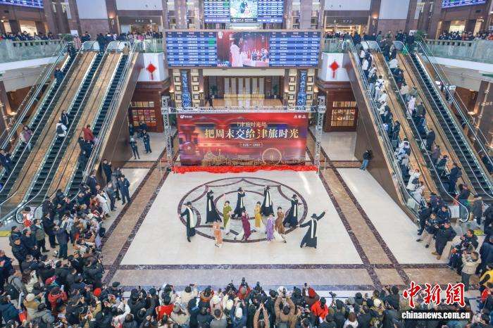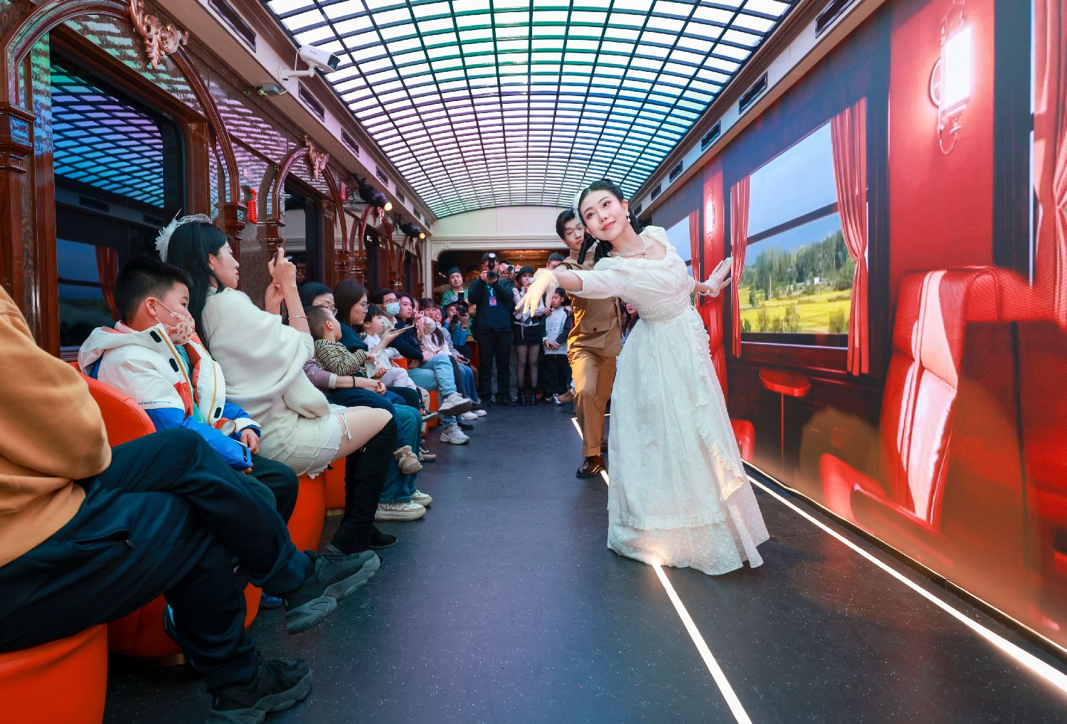 2026年1月1日,沉浸式文旅专列“津旅时光号”天津北站—北京站线路正式开通运营。本次北京线路全新升级,列车保留10节特色主题车厢布局,融合津派非遗、现代科技、沉浸式演艺与津味文创美食,打造“行走的移动文旅地标”。图为游客在车厢内观看舞蹈表演。中新社