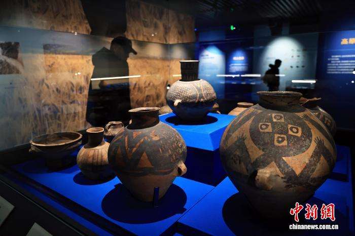 参观者观看展出的新石器时代马家窑陶器。中新网