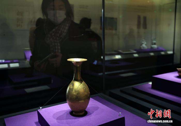 参观者观看展出的唐代金胡瓶。中新网