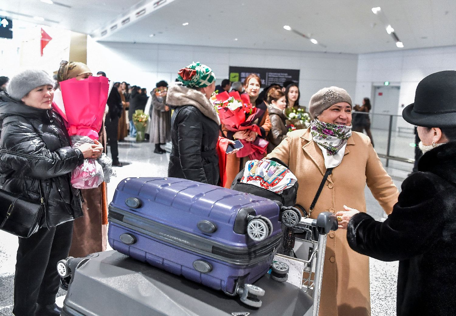1月4日,新疆乌鲁木齐天山国际机场,由42名旅居土耳其的新疆籍侨胞组成的探亲团抵达乌鲁木齐,接机的侨胞亲属献上鲜花,并亲切拥抱,欢迎他们回到家乡。中新社