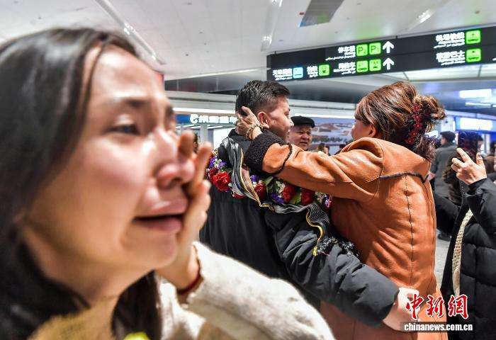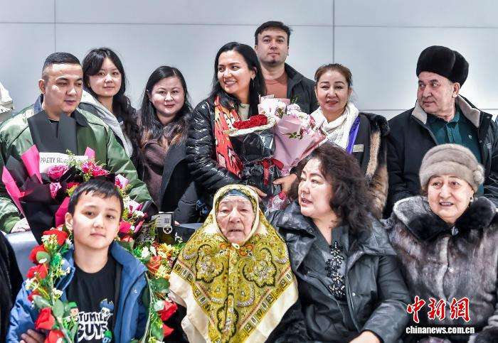 1月4日,新疆乌鲁木齐天山国际机场,由42名旅居土耳其的新疆籍侨胞组成的探亲团抵达乌鲁木齐,接机的侨胞亲属献上鲜花,并亲切拥抱,欢迎他们回到家乡。中新网