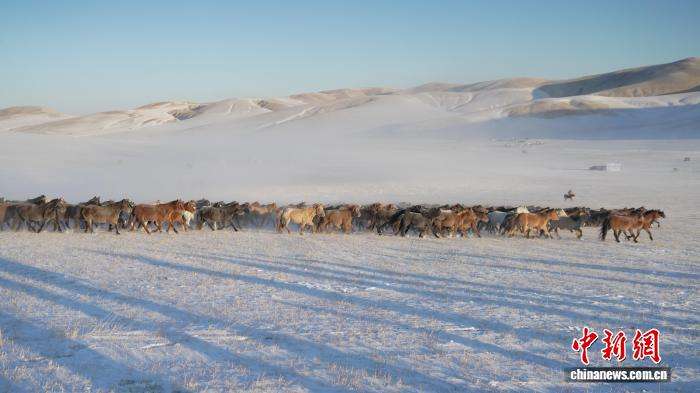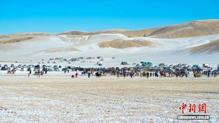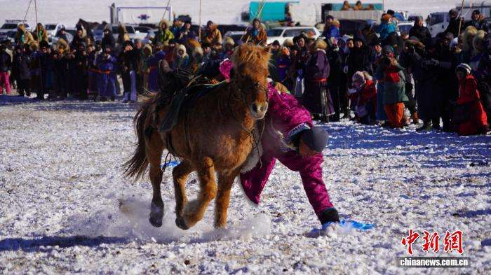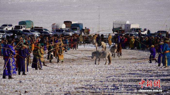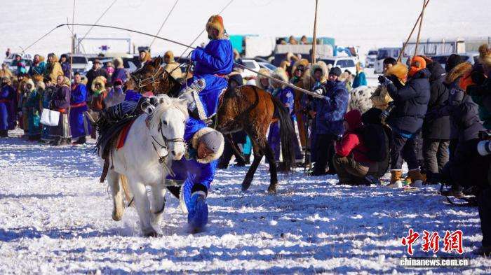 1月7日,一场以“银色乌珠穆沁·千马驰雪”为主题的马文化那达慕在内蒙古自治区锡林郭勒盟西乌珠穆沁旗举办。活动为期1天,设置有套马、驯烈马、马背拾哈达、赛马等项目。牧民们身着漂亮的民族服饰,踏雪赴会。图为牧民在驯烈马。中新社