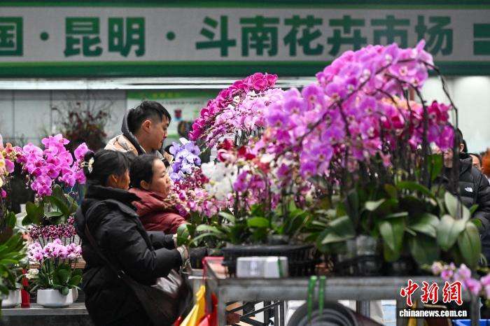 近日,云南昆明斗南花卉市场内售卖的蝴蝶兰、冬青、黄金香柳、黄金果等年宵花因色彩明艳、寓意吉祥受到消费者青睐。图为1月7日,消费者选购年宵花。中新社