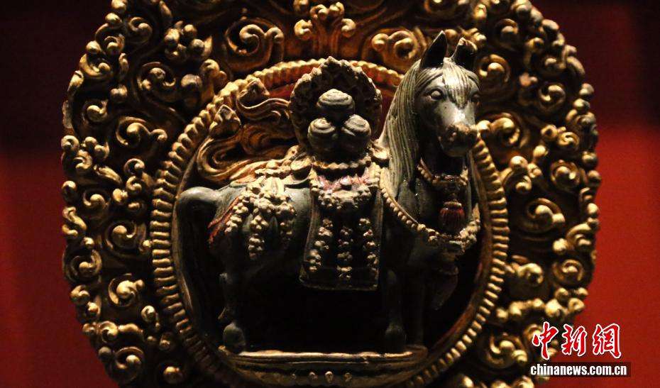 1月7日,青海省博物馆展出的清代木雕彩绘马宝供器。中新网