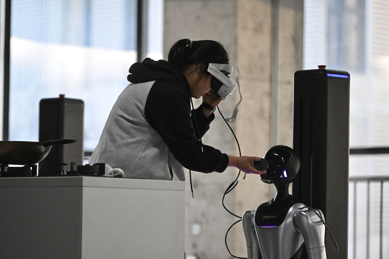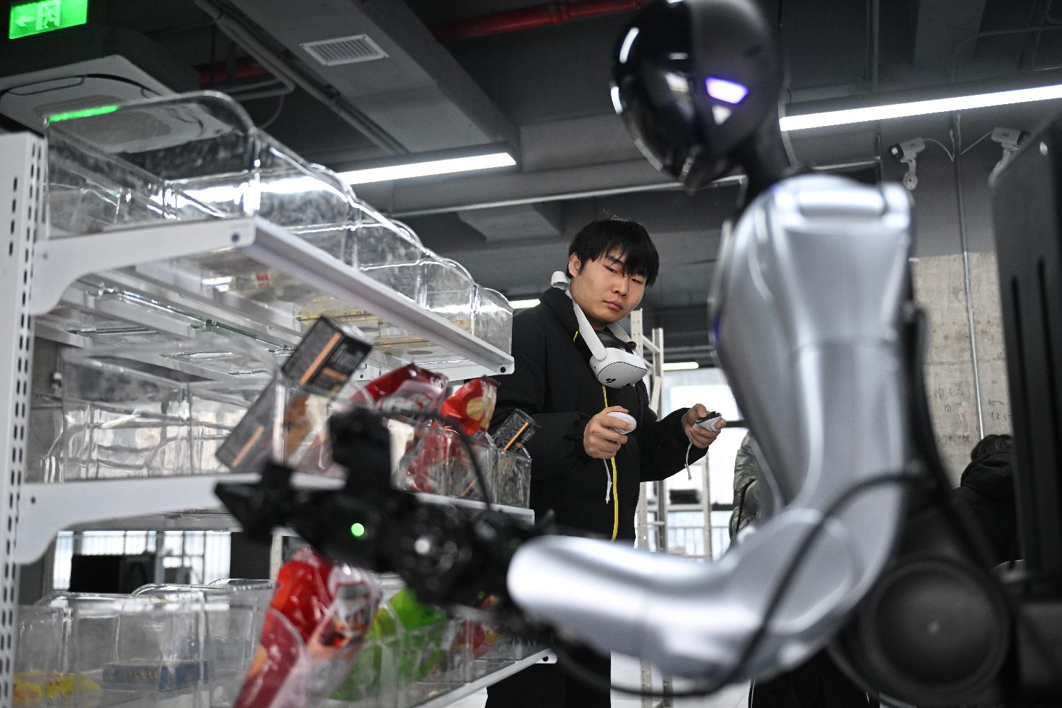 机器人训练师朱阳光操控人形机器人拿取商品。中新社