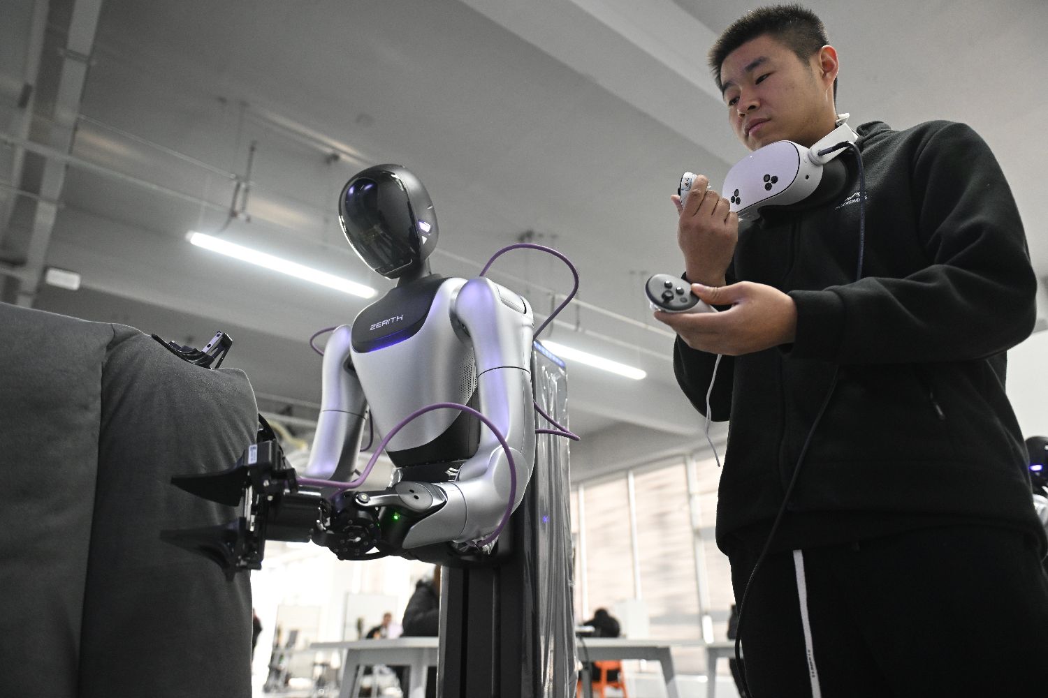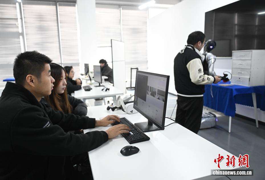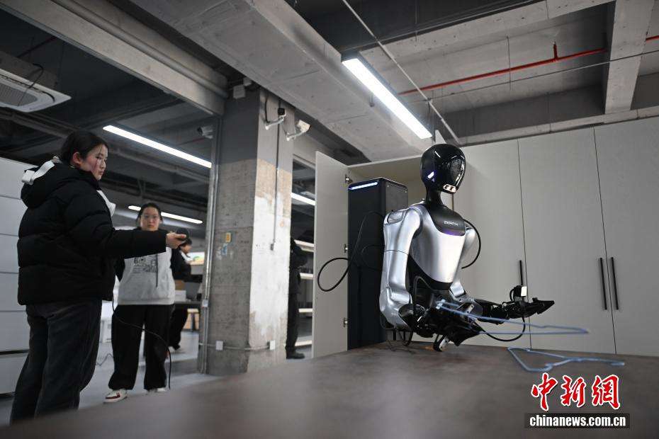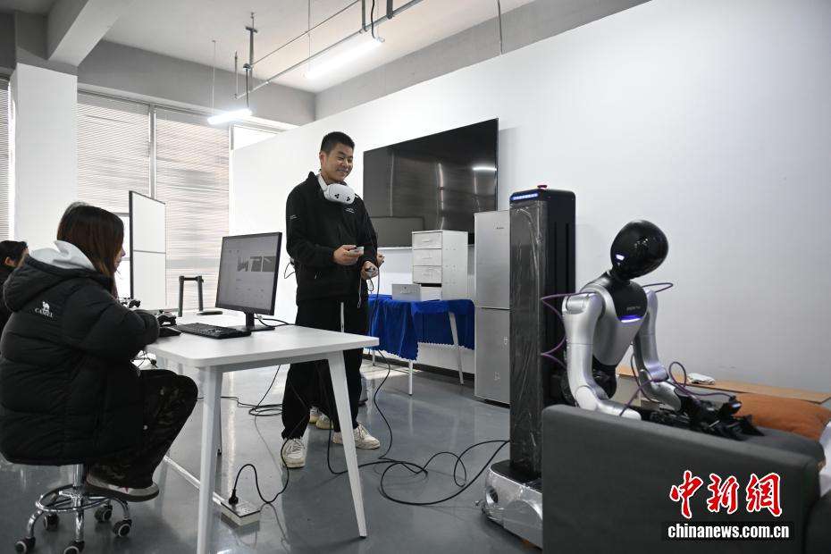 1月8日,在安徽合肥零次方机器人数据采集中心,身为“老师”的机器人数据采集员带领机器人“学生”进行场景实操训练。从训练动作细节调校,再到能力评估、场景考验,数据采集员全程参与,机器人通过学习,方能顺利“毕业”,正式走向各类实际应用场景。图为机器人训练师连接人形机器人。中新社