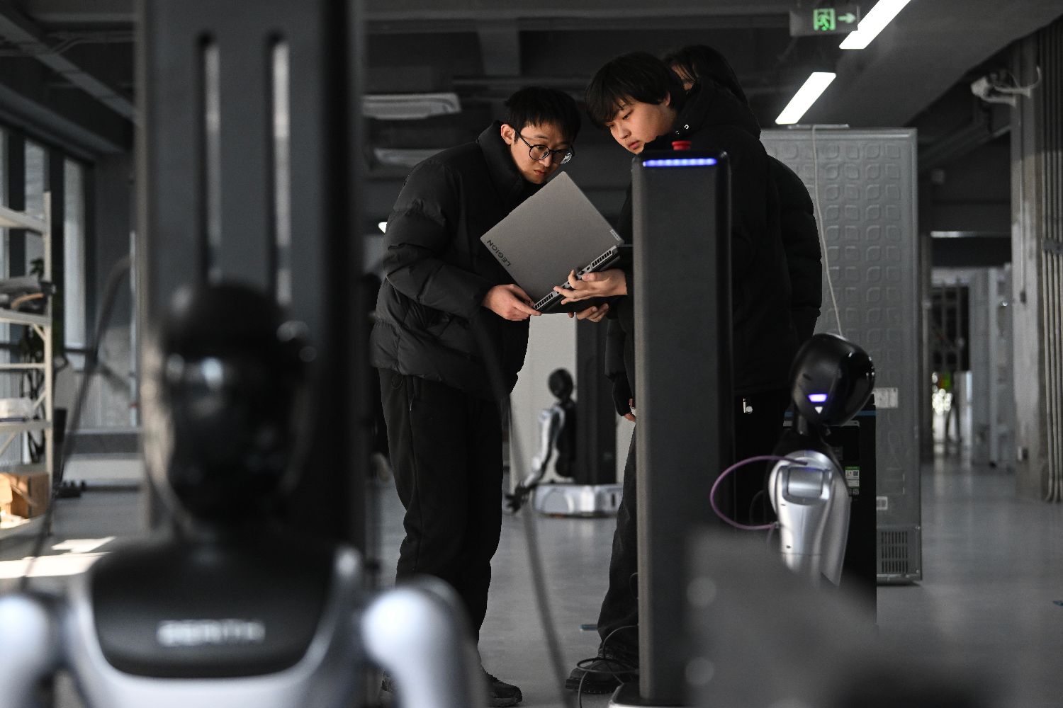 人形机器人训练师一起研究人形机器人运行数据,查找测试中出现失败的原因。中新社
