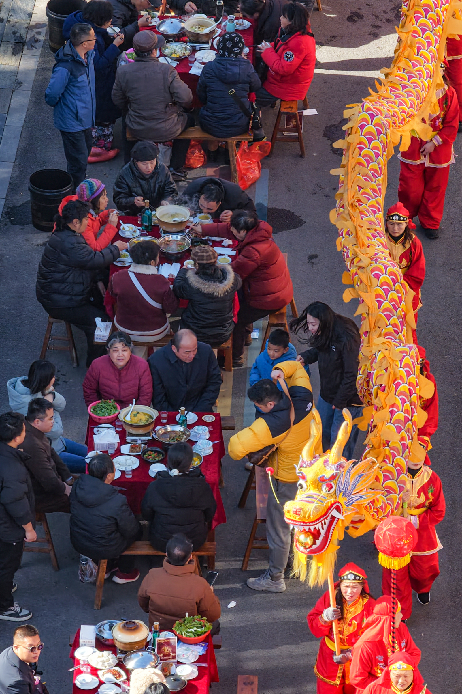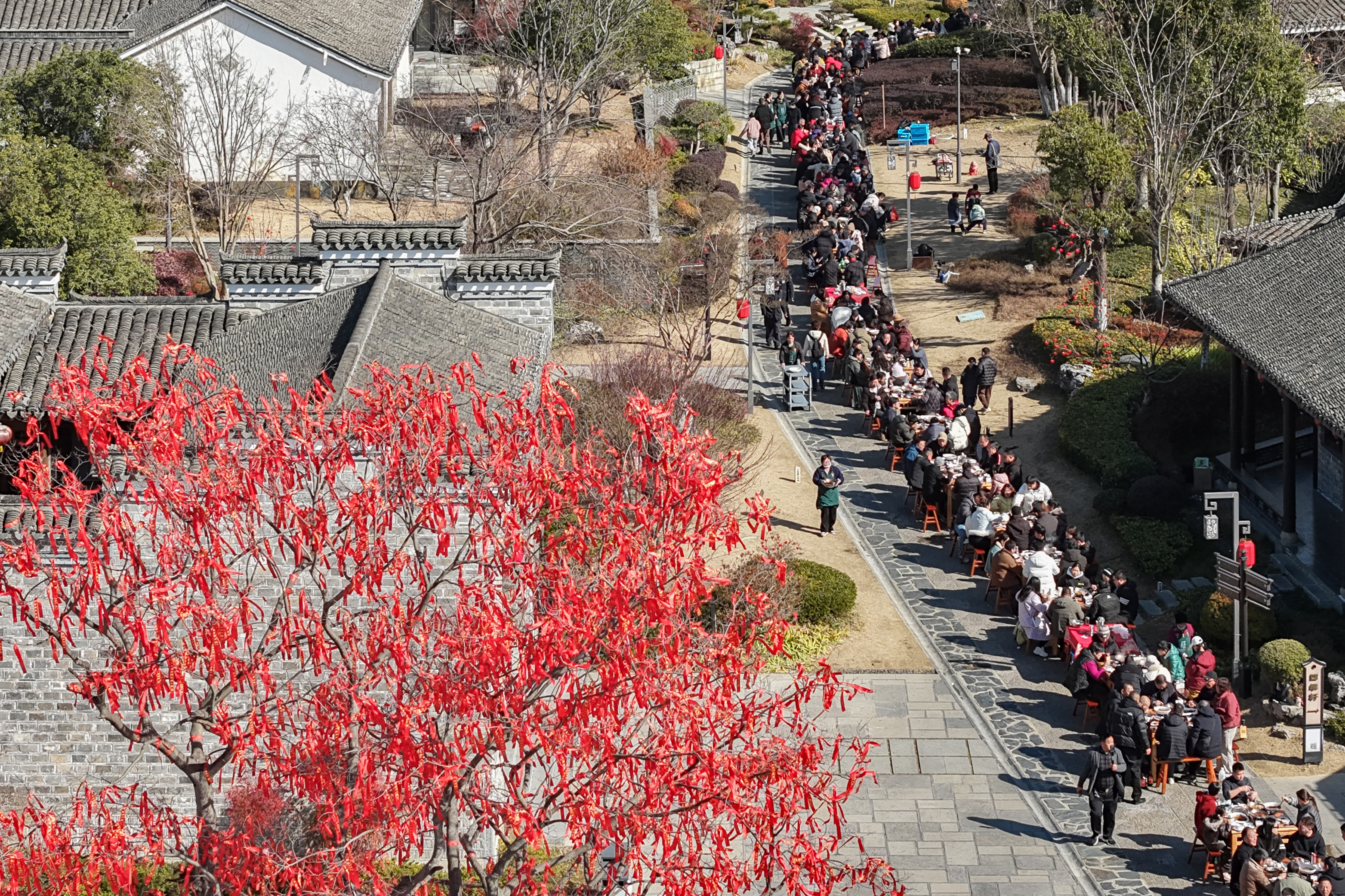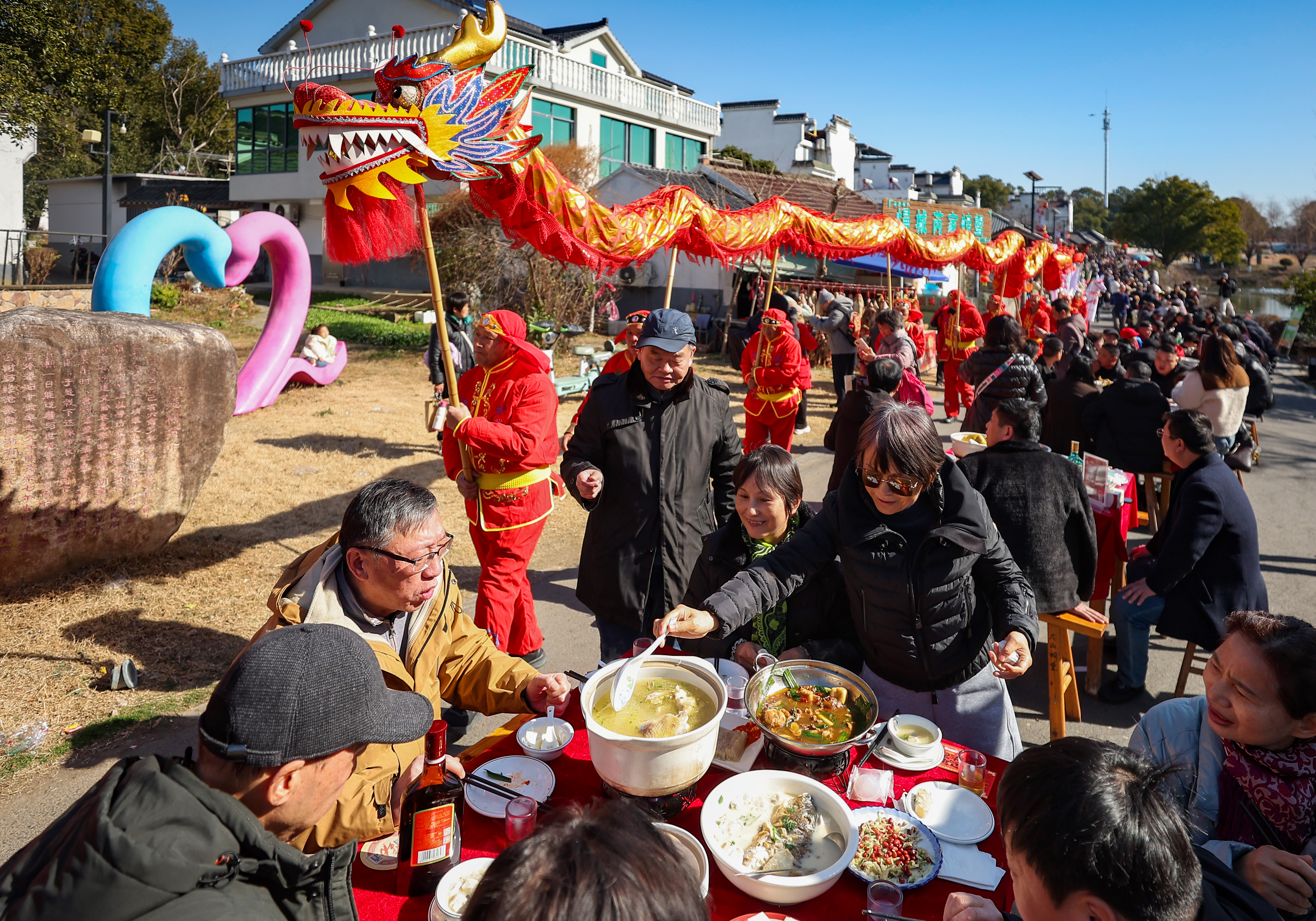 1月11日,江苏南京高淳桠溪国际慢城长街宴热闹开席,450余桌宴席在1600多米的道路上依次排开,特色乡村美食、地道农家味道、民俗表演队伍巡游,洋溢着喜庆氛围。据了解,桠溪国际慢城长街宴不仅全面展示了当地的农家美食、民宿发展与特色文化,更有效地带动了乡村旅游发展。图为人们品味高淳特色美食。中新社