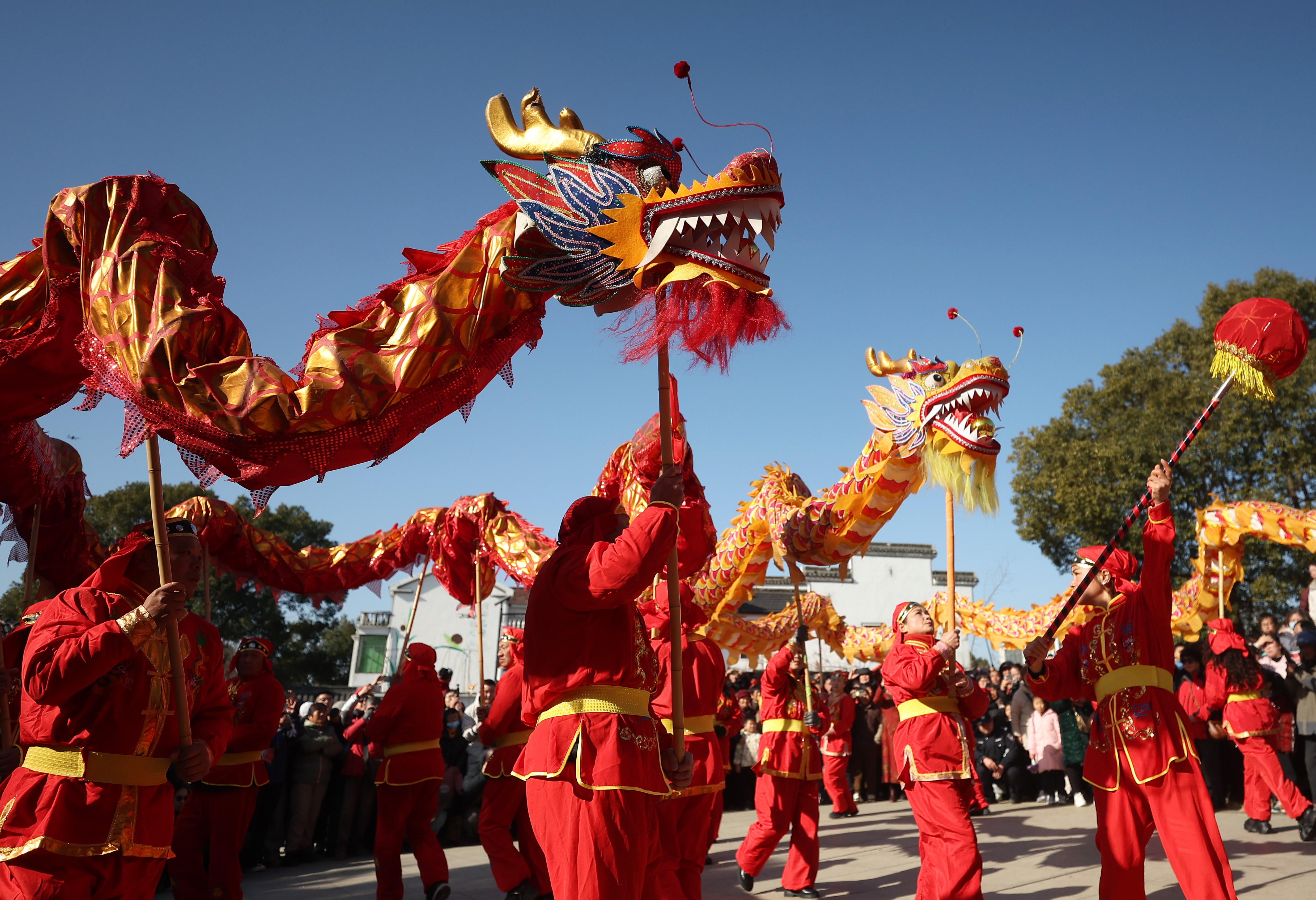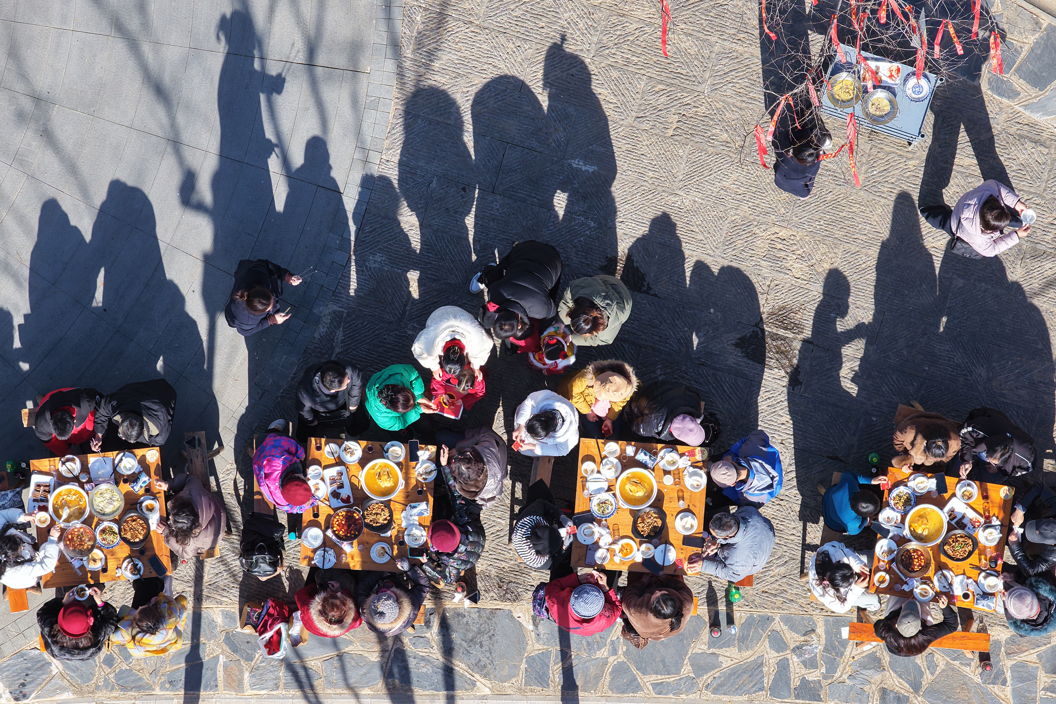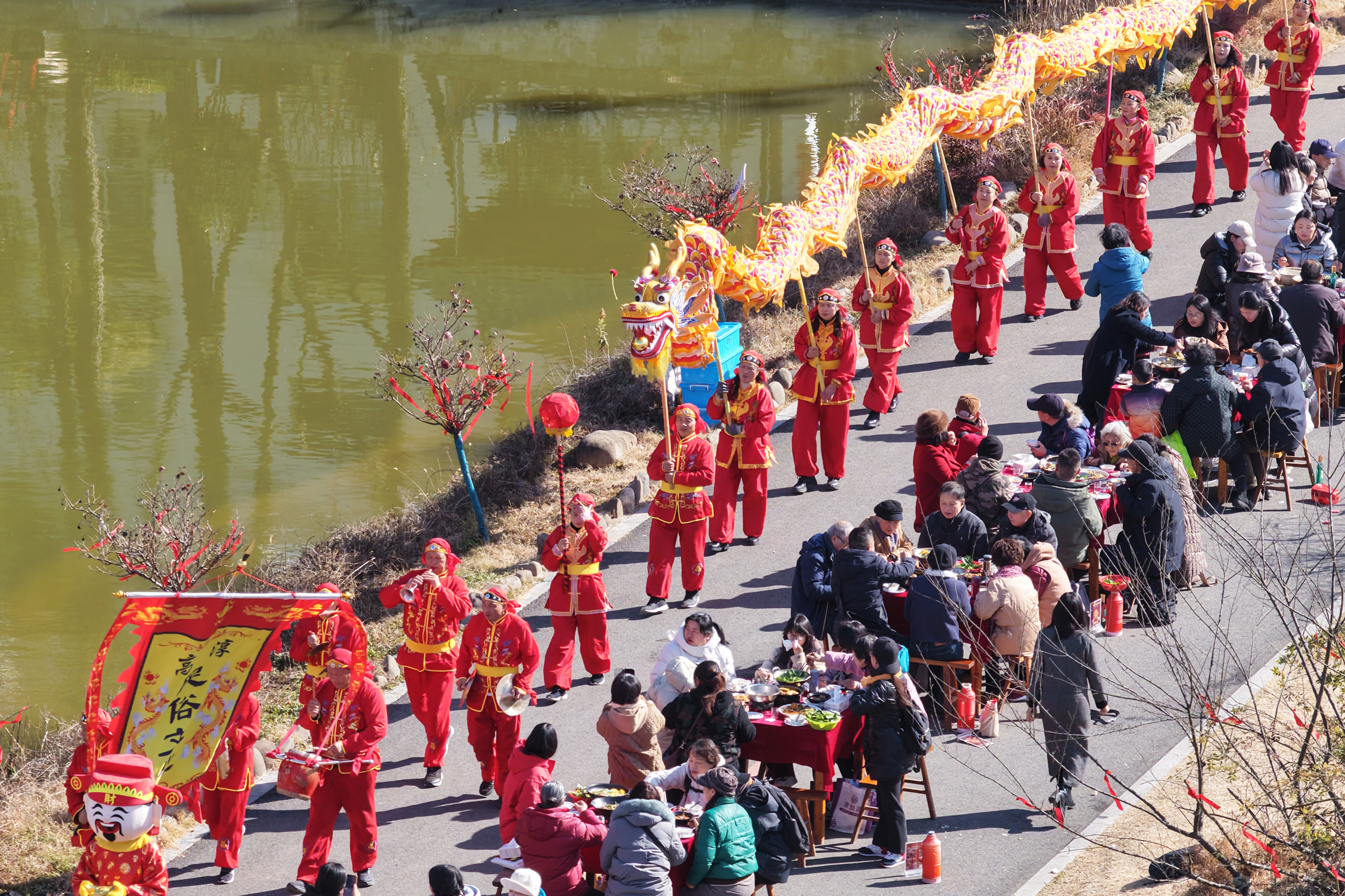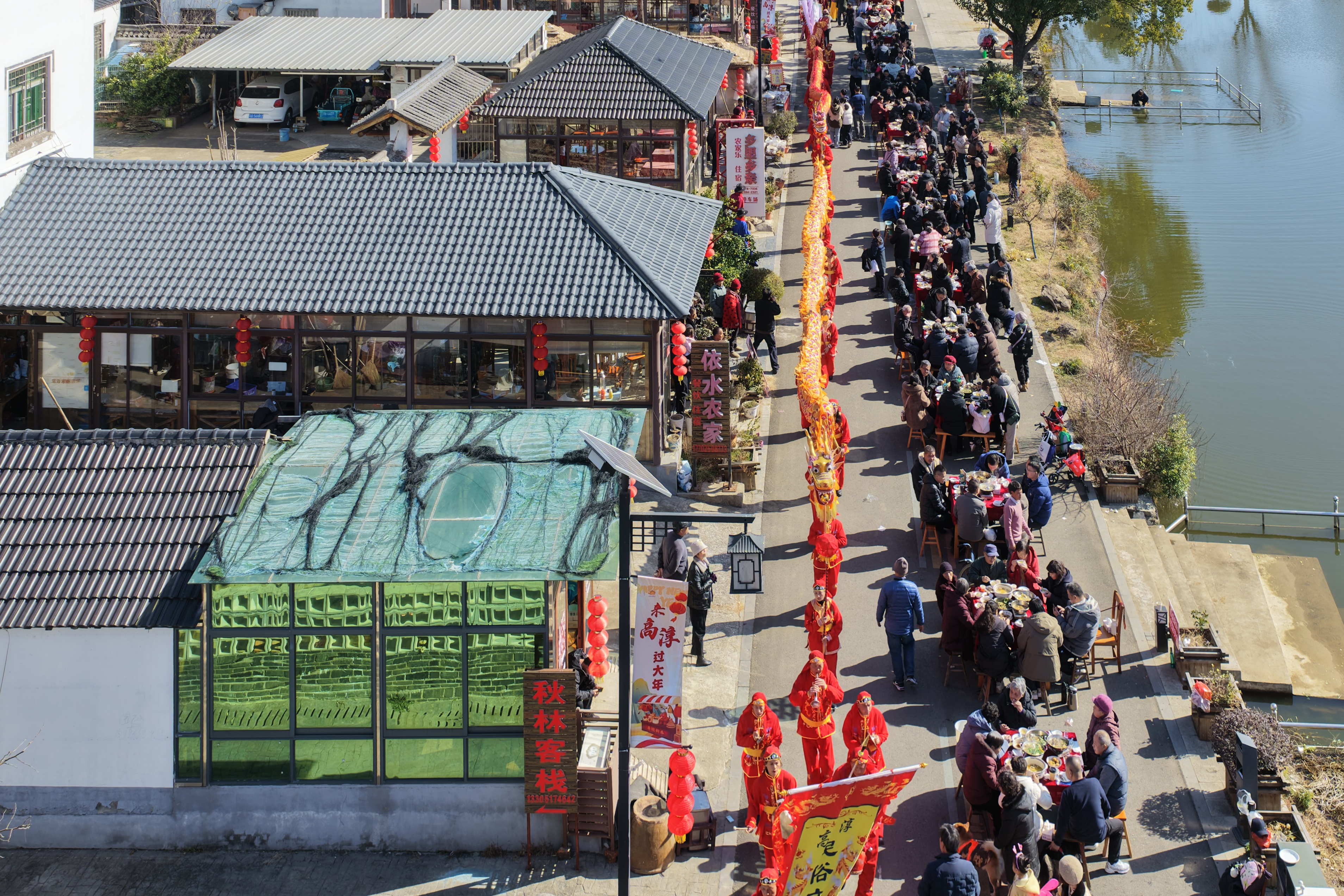 1月11日,江苏南京高淳桠溪国际慢城长街宴热闹开席,450余桌宴席在1600多米的道路上依次排开,特色乡村美食、地道农家味道、民俗表演队伍巡游,洋溢着喜庆氛围。据了解,桠溪国际慢城长街宴不仅全面展示了当地的农家美食、民宿发展与特色文化,更有效地带动了乡村旅游发展。图为人们品味高淳特色美食。中新社