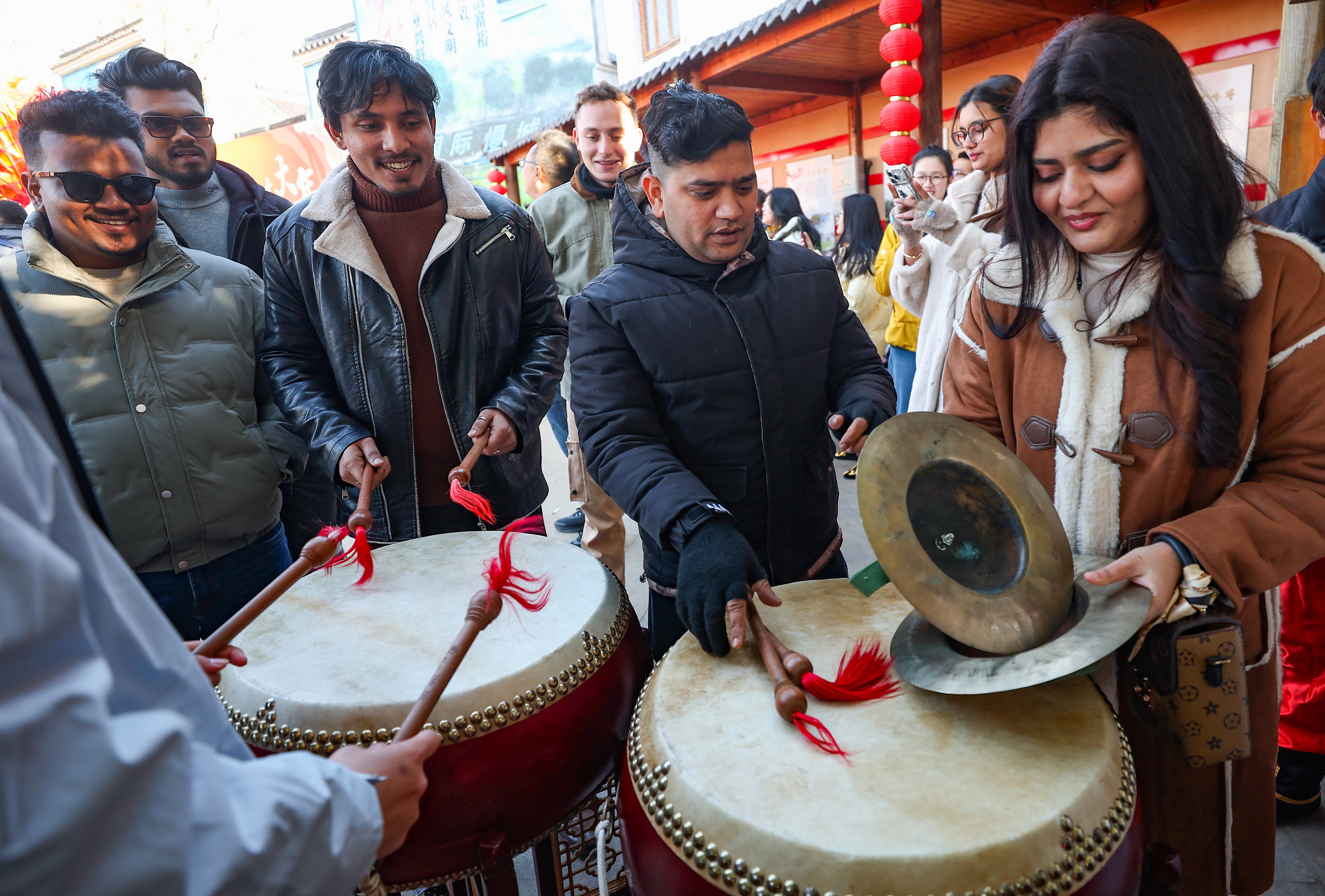 来自南京理工大学和南京邮电大学的留学生体验敲锣打鼓。中新社