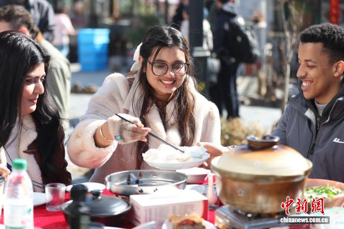 来自南京理工大学和南京邮电大学的留学生品味高淳特色美食。中新网