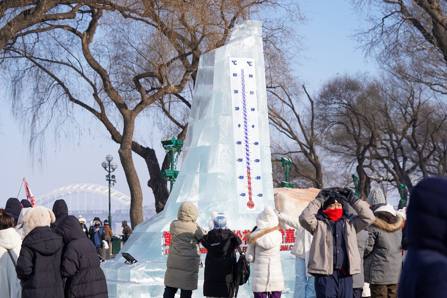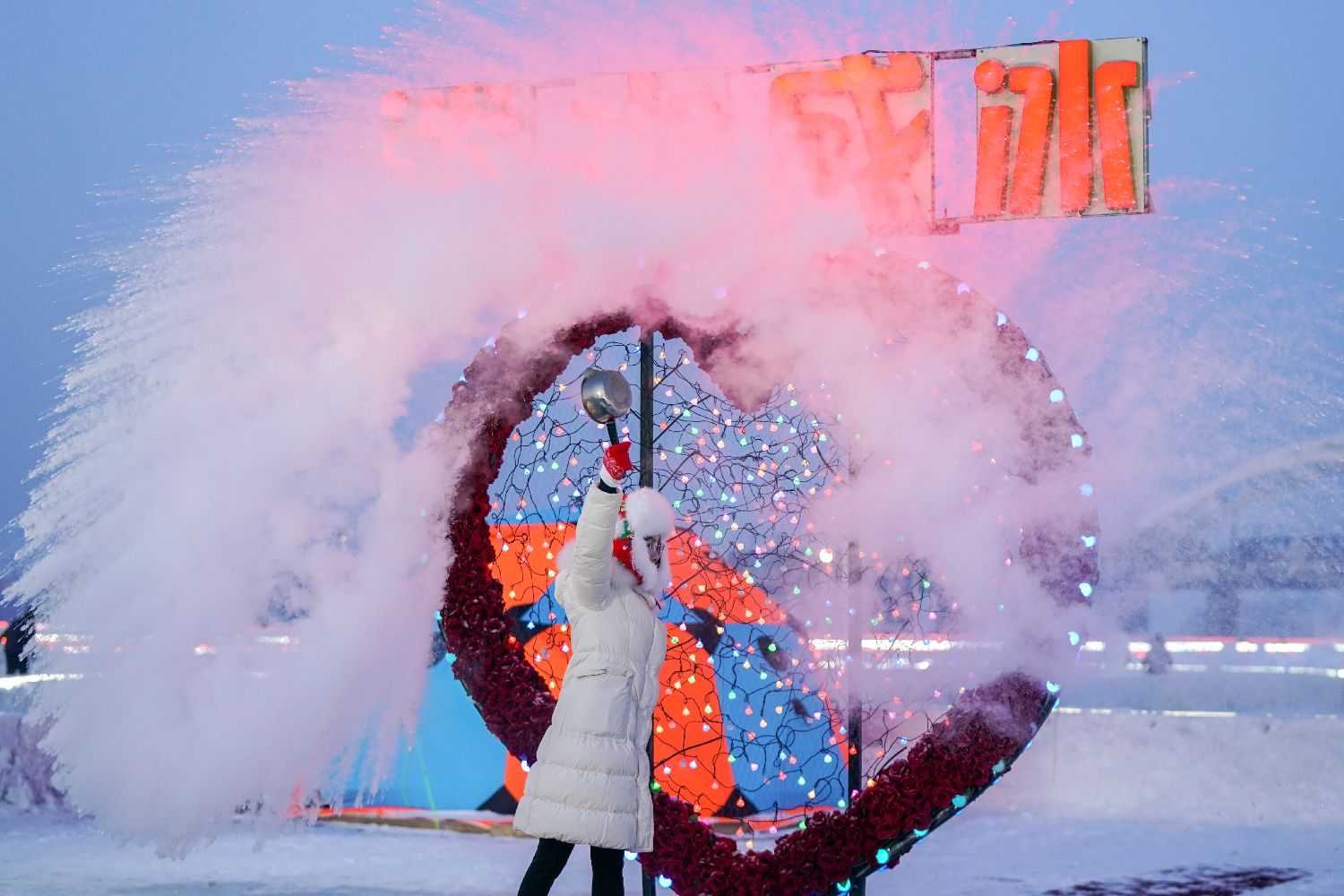 1月11日,黑龙江哈尔滨天气晴好,市民游客在第八届哈尔滨松花江冰雪嘉年华上体验各类冰雪项目,乐享冰雪之趣。图为游人在松花江冰雪嘉年华体验泼水成冰。中新社