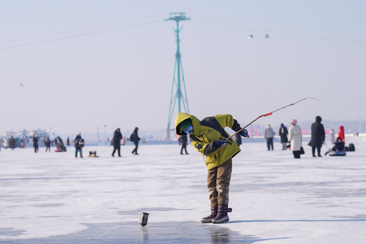1月11日,小朋友在松花江冰雪嘉年华抽冰尜。中新社