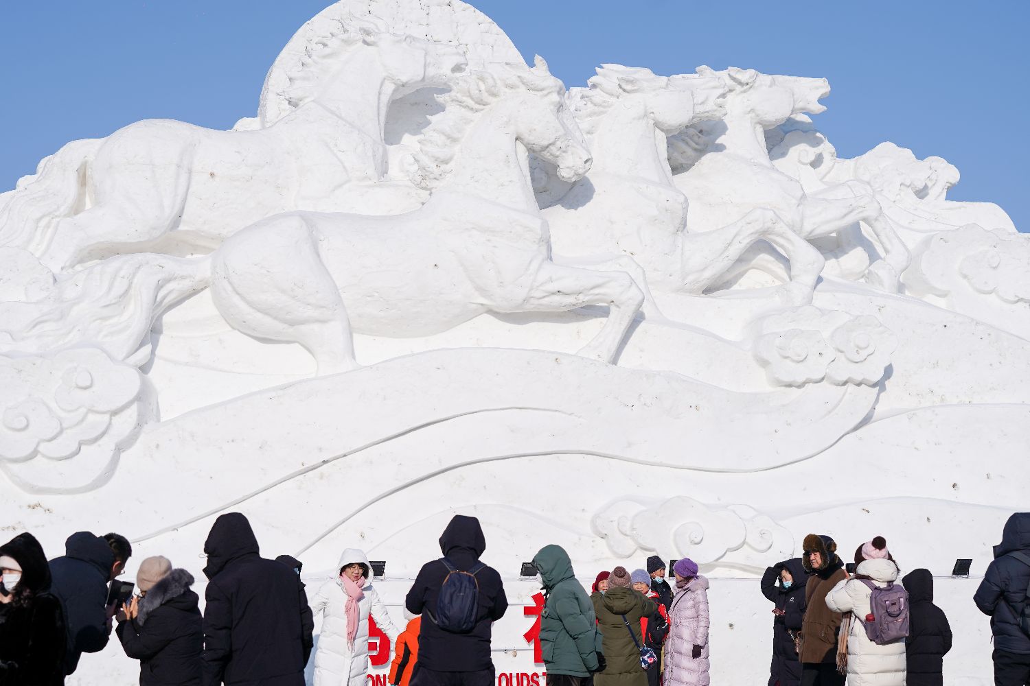 1月11日,游人欣赏松花江冰雪嘉年华“马踏祥云”雪雕。中新社