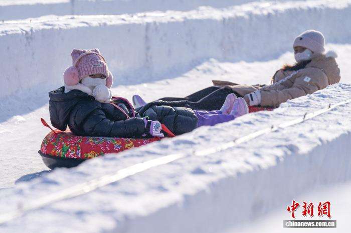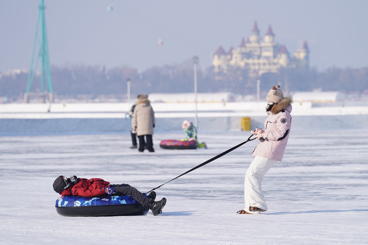 1月11日,游人在松花江冰雪嘉年华玩雪圈。中新社