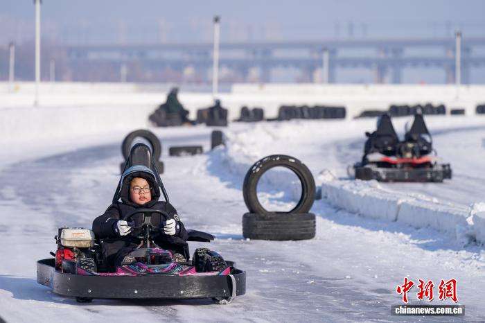 1月11日,小朋友在松花江冰雪嘉年华体验卡丁车。中新网