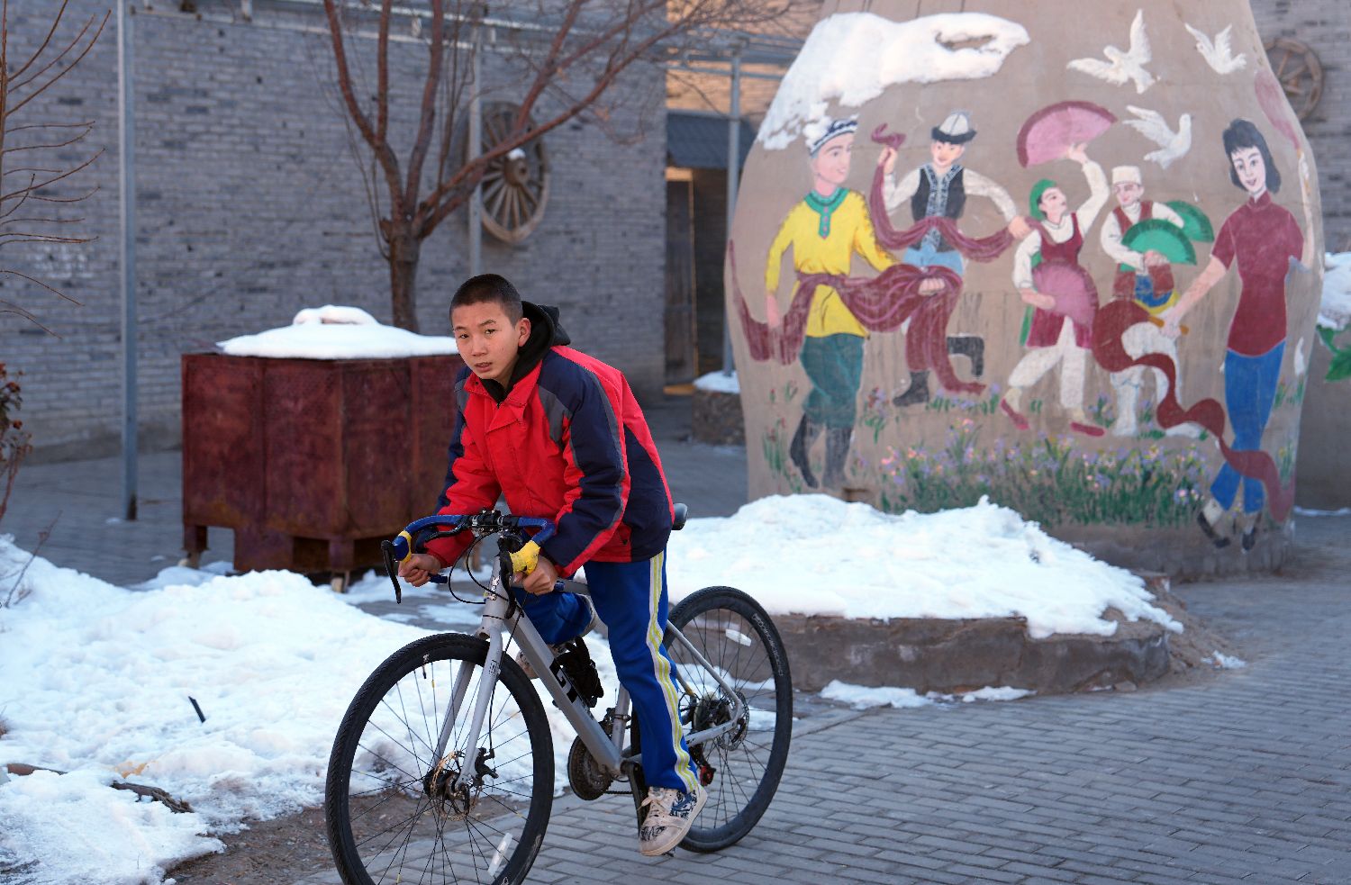 锡伯古城位于新疆伊犁察布查尔县境内孙扎齐牛录镇,是面向全中国及中亚打造的综合性旅游目的地。锡伯族作为古代鲜卑族的后裔,历史悠久。锡伯族人至今相对完好地保存着锡伯族的语言文字、民间歌舞、饮食文化、服饰刺绣、体育娱乐等传统文化,其中有不少已被列入各级非物质文化遗产保护名录。图为1月10日,少年在锡伯古城内骑行。中新社