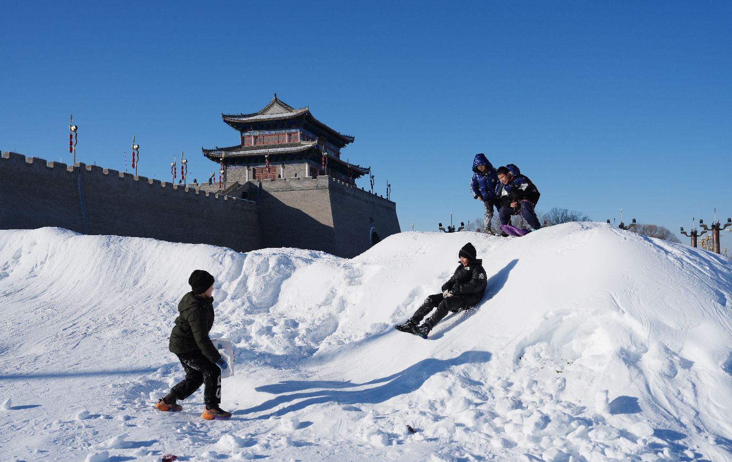 1月10日,儿童在锡伯古城外玩耍。中新社