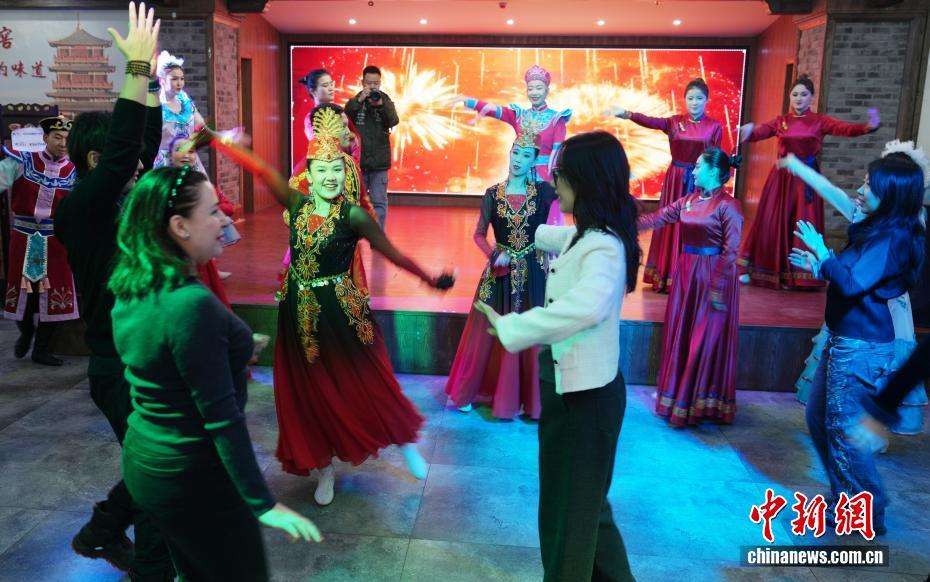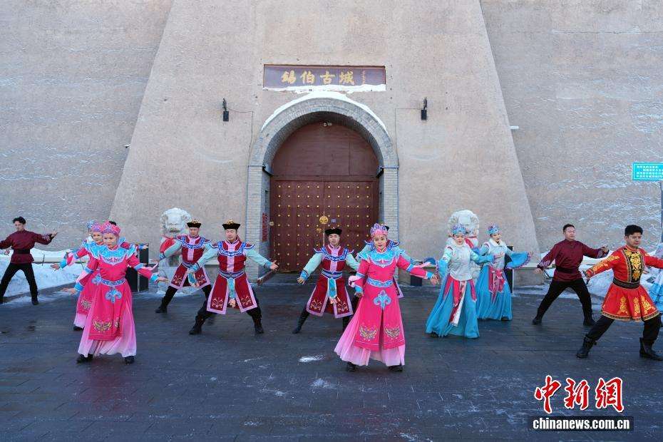 1月10日,游客在锡伯古城与当地专业舞者一起舞蹈。中新网