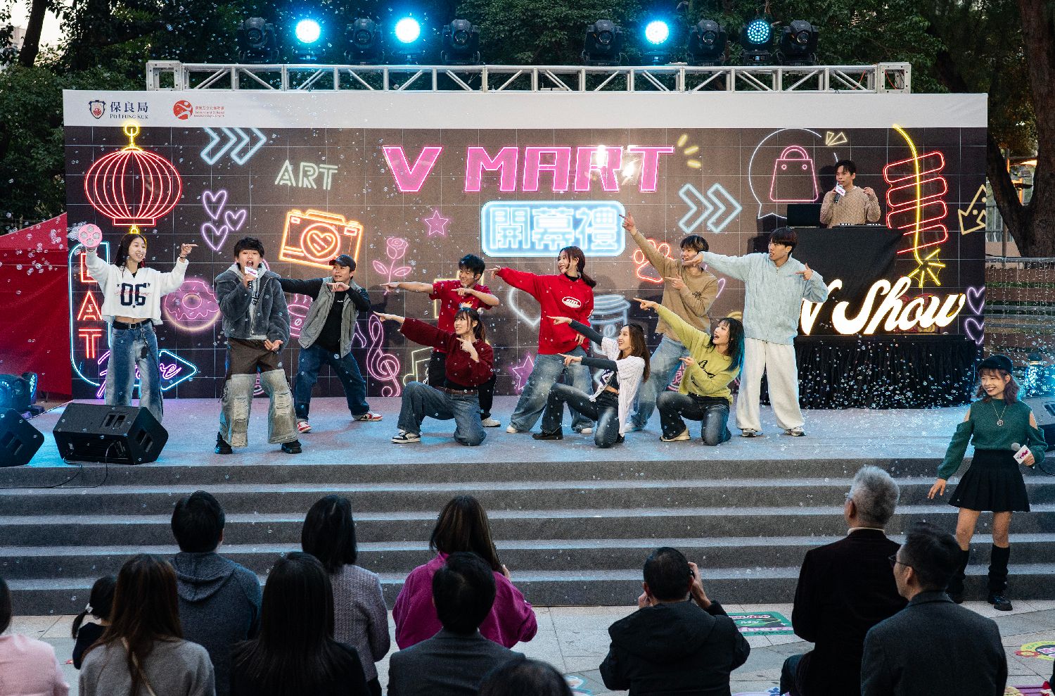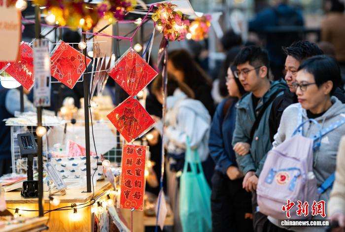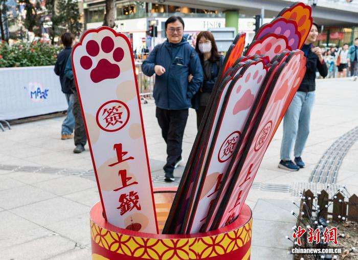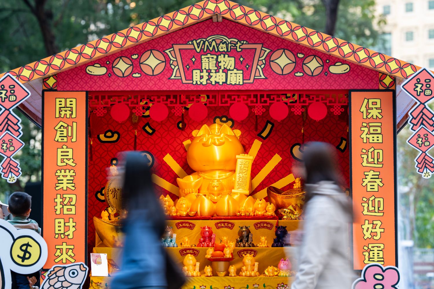 1月10日,由香港保良局承办的“VMart维园市集”在香港维多利亚公园开幕。市集包括“宠物财神庙”等趣味“打卡”装置、30个文创手工作品和美食摊位等,吸引市民和游客到访。图为市民游客经过市集上的“宠物财神庙”。中新社