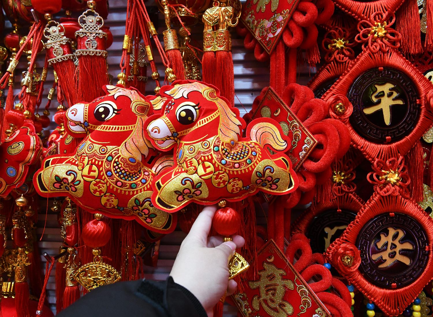 1月12日,一家批发市场挂满了马和鱼元素的挂饰年货。中新网