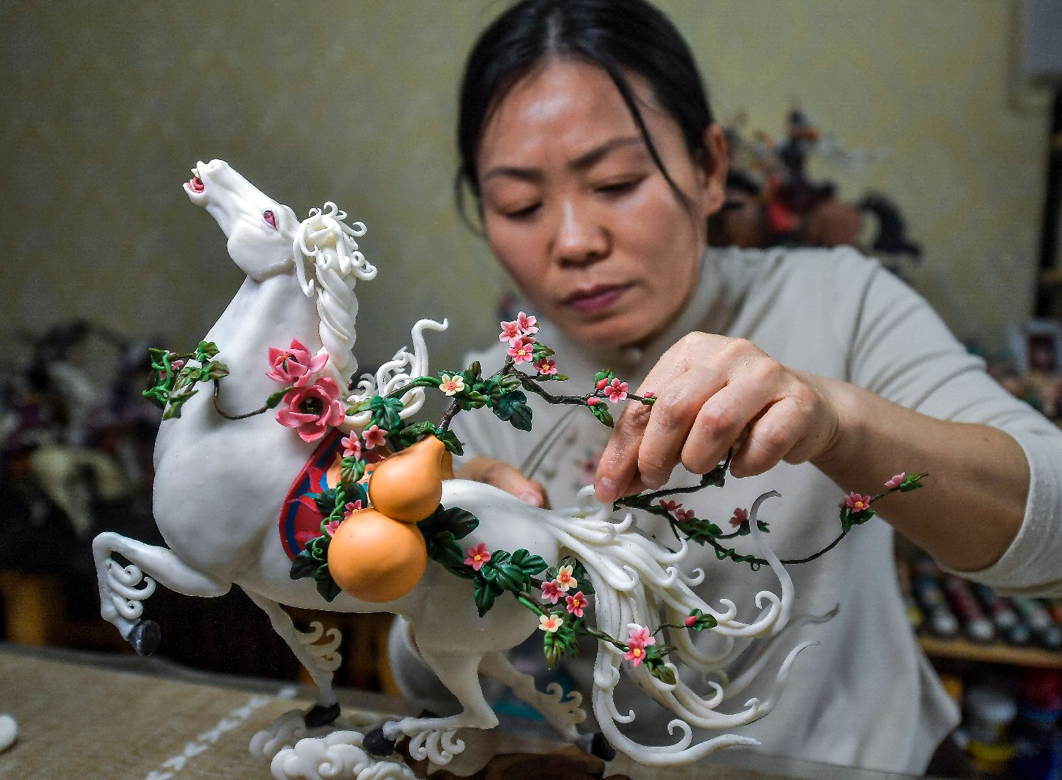 1月14日,王帆在工作室创作以马为主题的面塑作品《一路繁花》。中新社